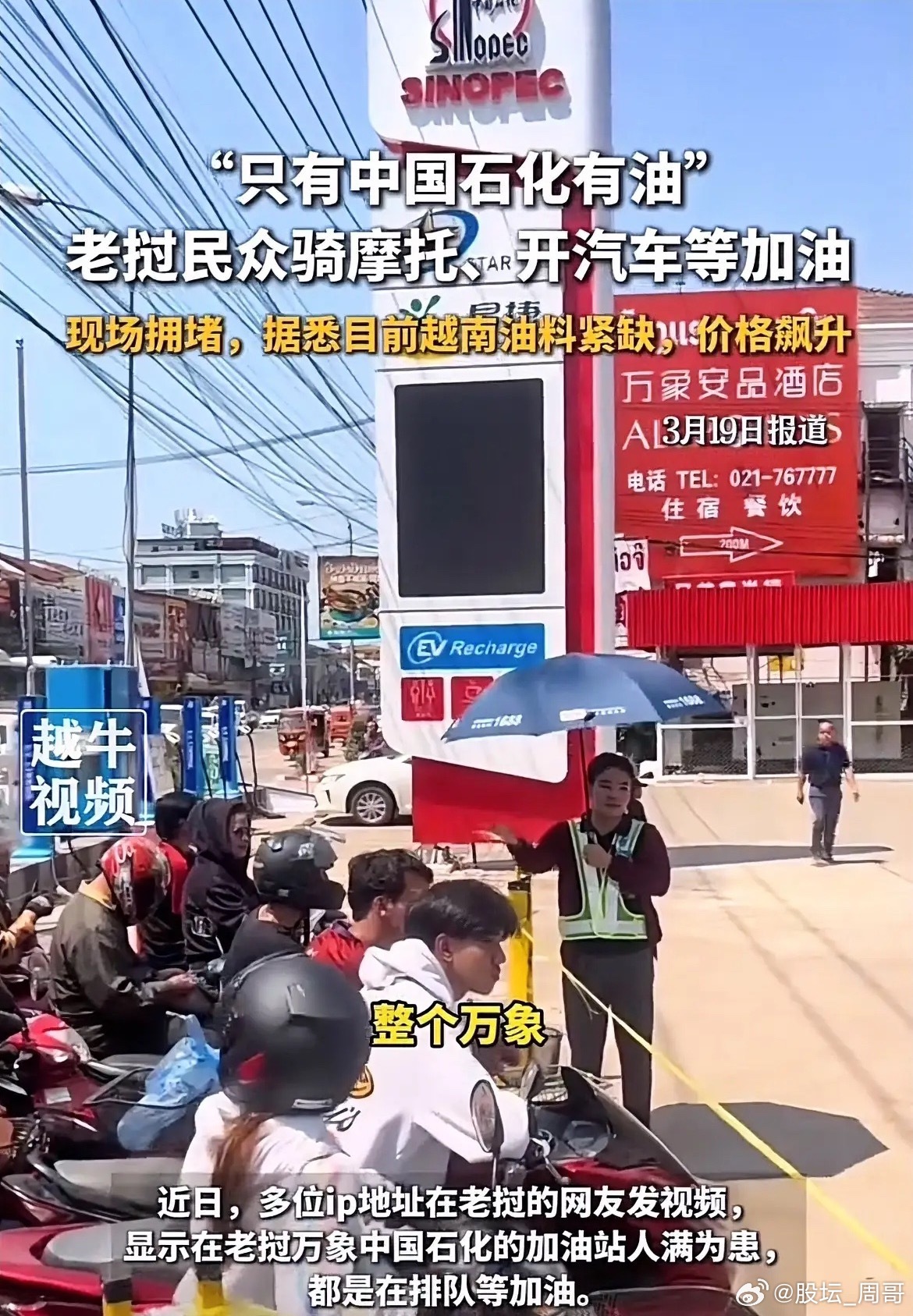 老挝万象只有中国石化有油,剩下其他加油站都已经停掉了,大家都在排着队紧锣密鼓地在石化加油。
