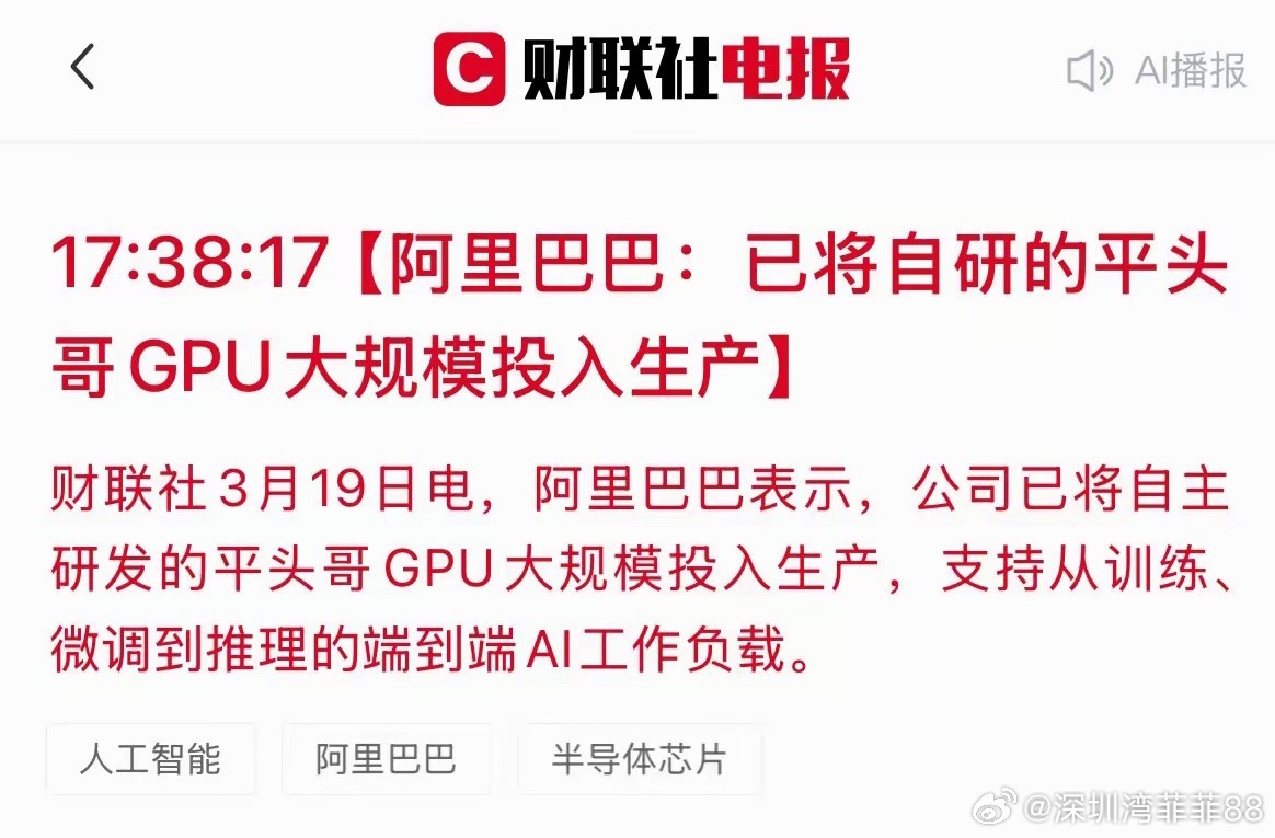 阿里自研平头哥GPU大规模投产!国产AI算力迎来关键突破!今天,阿里巴巴官宣:自