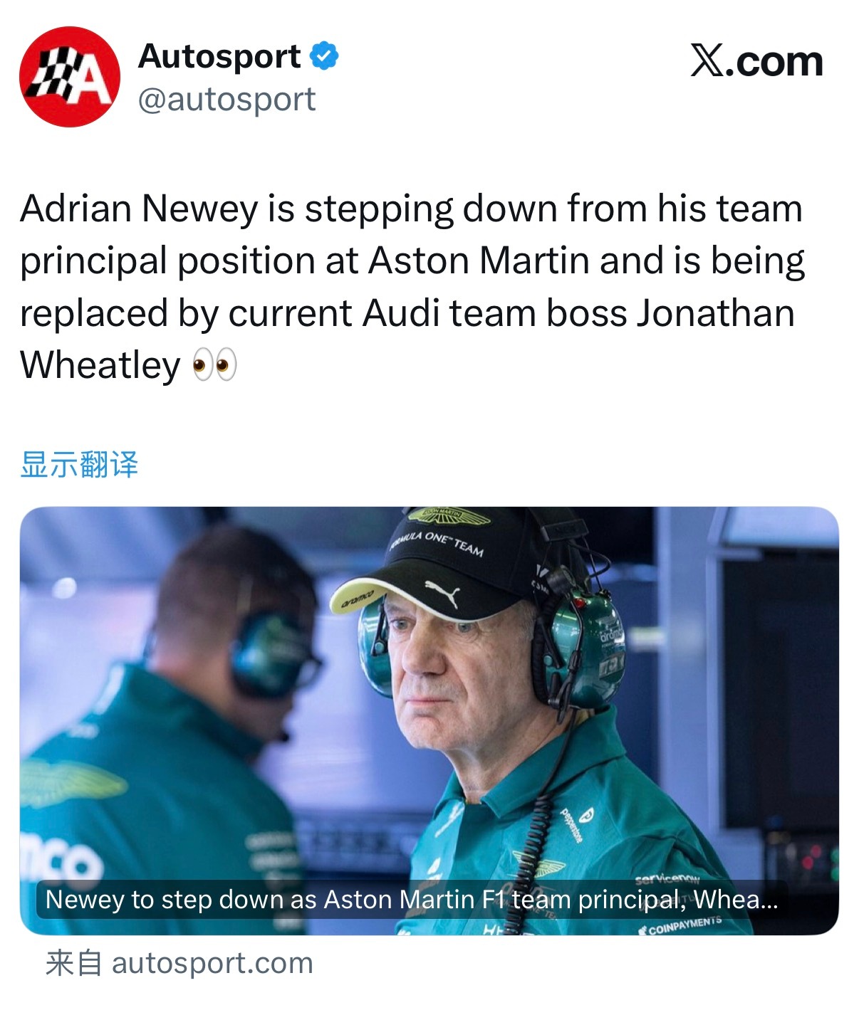 传闻:阿德里安·纽维将卸任阿斯顿·马丁车队领队职务,专注于领导车队的技术团队,而现任奥迪车队领队乔纳森·惠特利将加盟阿斯顿·马丁并担任车队领队,惠特利的转会时间取决于他的奥迪合同