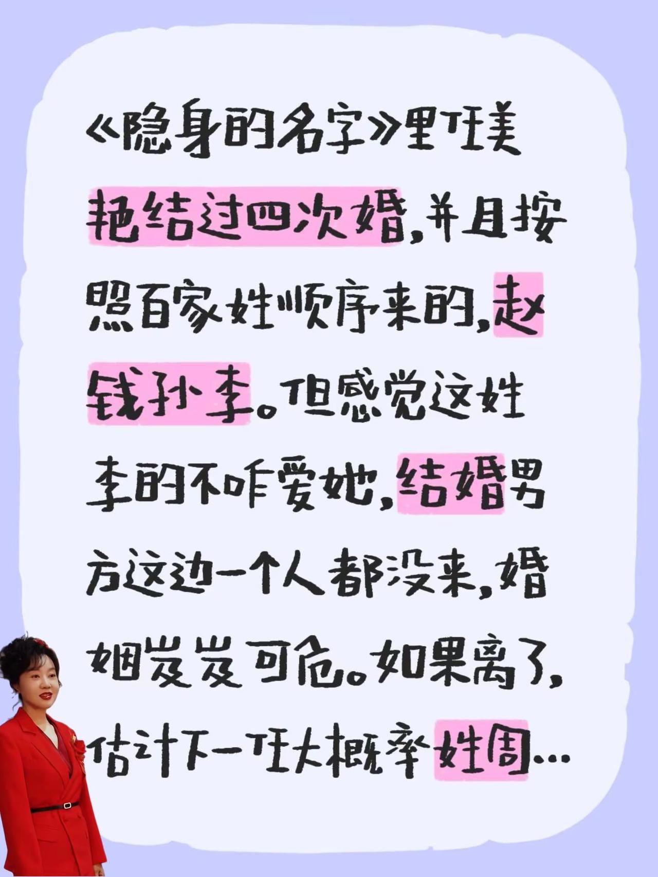 她当了四次新娘!《隐身的名字》里任美艳结过四次婚,并且按照百家姓顺序来的,赵钱孙李。但感觉这姓李的不咋爱她,结婚男方这边一个人都没来,婚姻岌岌可危。如果离了,估计下一任大概率姓周…隐身的名字首播观后感 隐身的名字