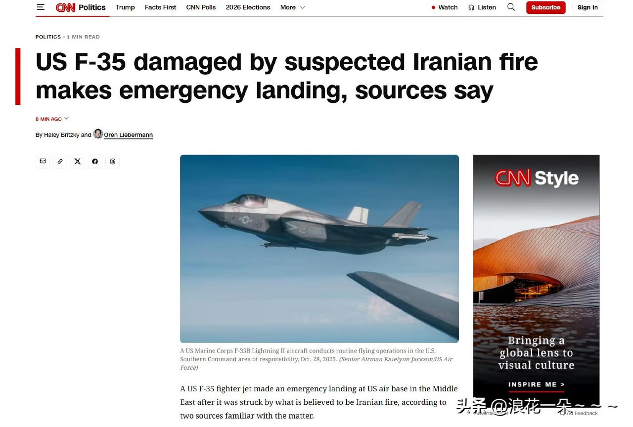 哦豁!就在刚刚, 据美国有线电视新闻网19日报道,美国一架F-35战机疑似被伊朗火力击中后紧急降落。 伊朗媒体报道, 美国F-35战斗机在历史上首次被击落? 要我说,这可是美国第5代隐形战机啊,价值基本在1亿美元左右。 如果最终确认是被伊朗方面击中,可以看出伊朗现在的导弹也是越打越有经验,厉害了! 信息来源:CCTV国际时讯,看看新闻Knews