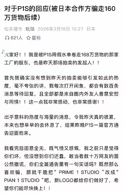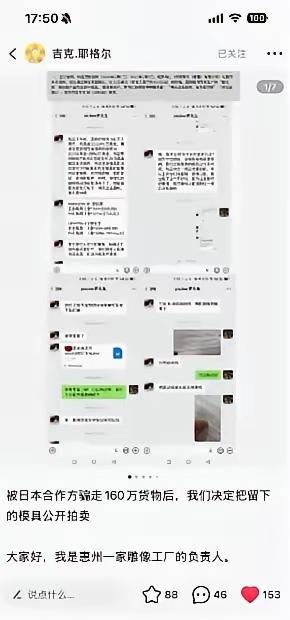 真刺基[捂脸]惠州工厂闲鱼硬刚日本公司,7万人围观出价飙到10万 今年最刺激的瓜在闲鱼上吃的。惠州一家雕像代工厂,给日本P1S公司代工5年,清算时被拖欠定金,还被一张水单骗走160万的货。 老板越想越气,不惯着了!直接把日本公司留下的模具挂闲鱼拍卖,同时开帖控诉。没想到瞬间爆火,7万人围观,出价飙到10万。 发阴阳公告抹黑中国工厂。结果老板更狠,直接就把合作合同、录音全晒上网。证据甩脸上,看谁还敢颠倒黑白。 "这波硬刚日本人,确实给力!""让他们明白,中国人不是好惹的。"评论区一边倒支持,闲鱼成了跨国维权新战场。 日本公司拖欠定金还用假水单骗货,典型的"白嫖"操作。以前外贸工厂吃哑巴亏,现在老板懂法、懂网、懂舆论,直接在平台公开对线,让骗子社死。 160万的教训,换来7万人的声援。闲鱼不只是卖二手,成了中国工厂维权的扩音器。日本公司以为能蒙混过关,结果全网围观打脸。这波操作告诉我们:遇到无赖别忍,证据晒出来,网友帮你讨公道。
