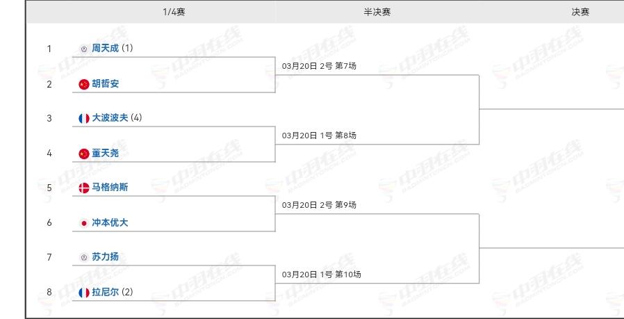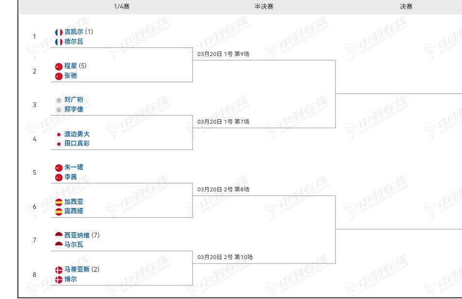 奥尔良羽毛球大师赛八强全部产生,国羽昨天战绩六胜二负。 男单胡哲安、董天尧晋级八强,王正行被淘汰。 男双胡珂源/林祥毅、女双鲍骊婧/罗徐敏、混双星驰组合、朱一珺/李茜晋级。 罗意/王汀戈被淘汰。 今天1/4决赛下午5点开打。