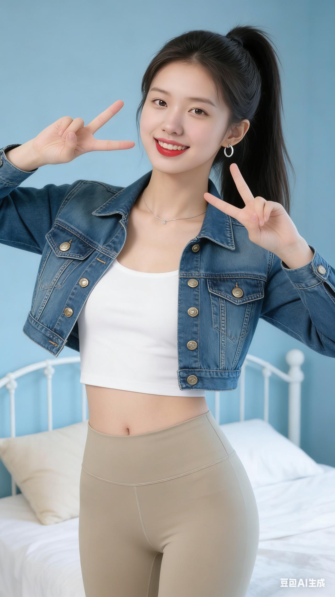 主体:20-25岁年轻东亚女性,鹅蛋脸,明亮杏眼,元气活泼气质,高马尾黑色长发,妆容清新元气,唇色偏红,笑容灿烂露齿,充满感染力。 服饰:蓝色短款牛仔外套(金属纽扣装饰),内搭白色短款吊带背心,下装为高腰浅卡其色紧身瑜伽裤,佩戴银色细项链与圆形银色耳饰。 场景:简约清新的卧室场景,背景是浅蓝色墙面与白色铁艺床,床上铺有白色床品与浅米色抱枕,光线明亮柔和,整体氛围干净清爽。 动作与神态:站姿活泼,双手抬起至脸颊两侧,手掌张开,眼神明亮看向镜头,笑容甜美开朗,充满青春活力。 风格与画质:写实人像摄影,8K高清,浅景深,明亮自然光,构图偏人像特写,色调清新明快,质感细腻,充满元气少女感。时尚女性气质 时尚女性形象 女性年龄美学