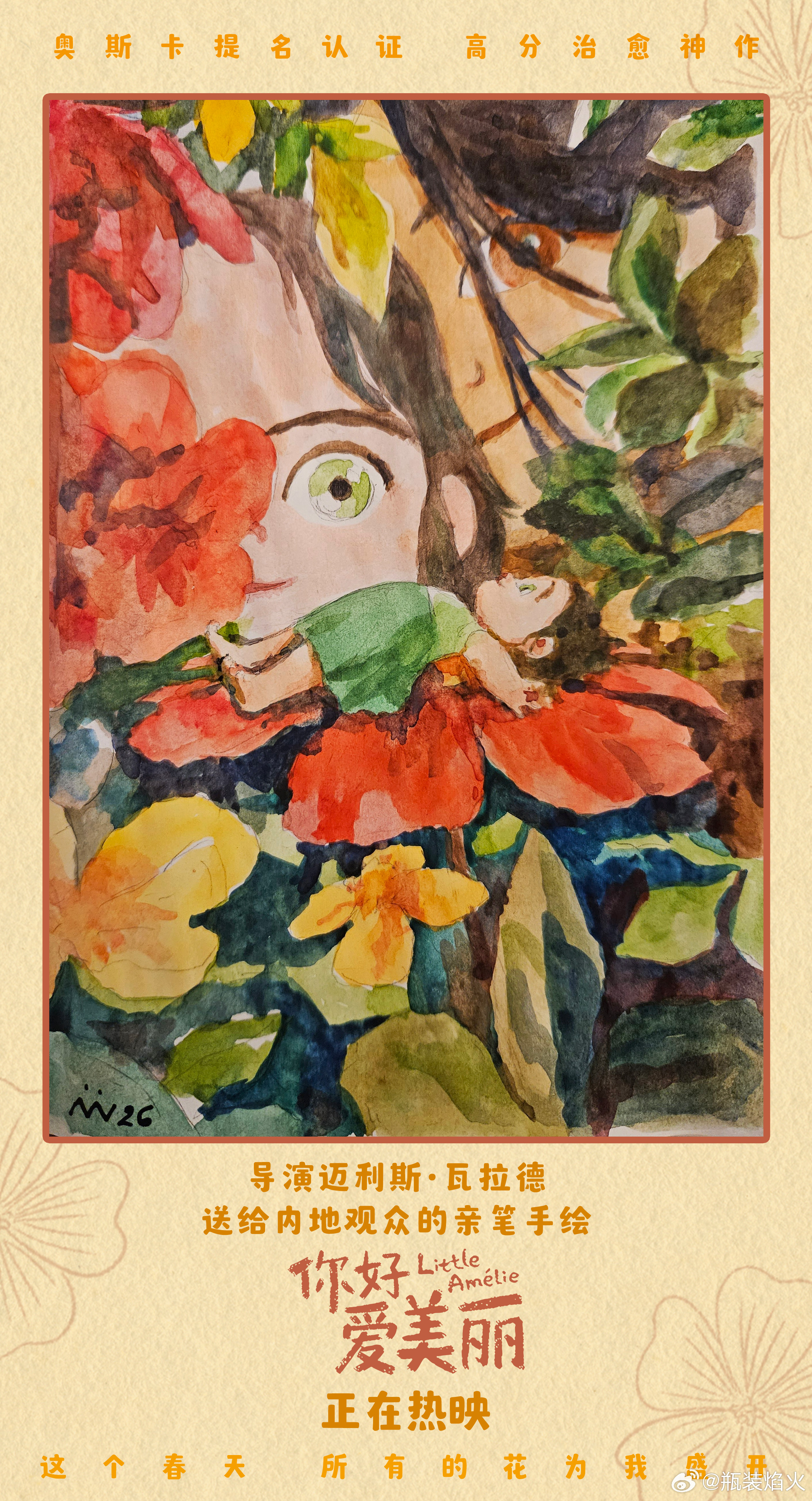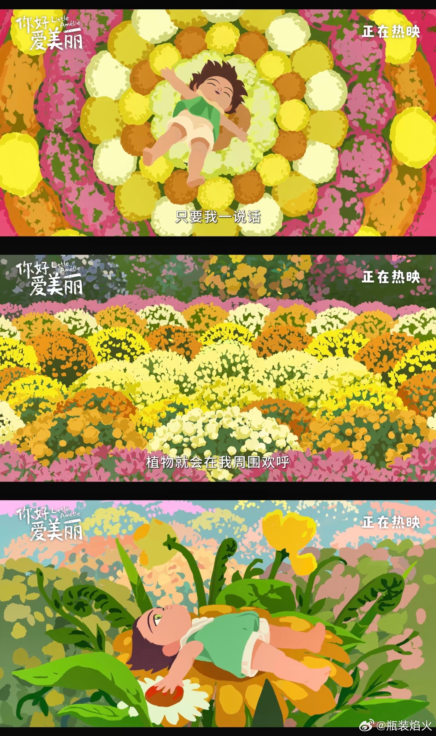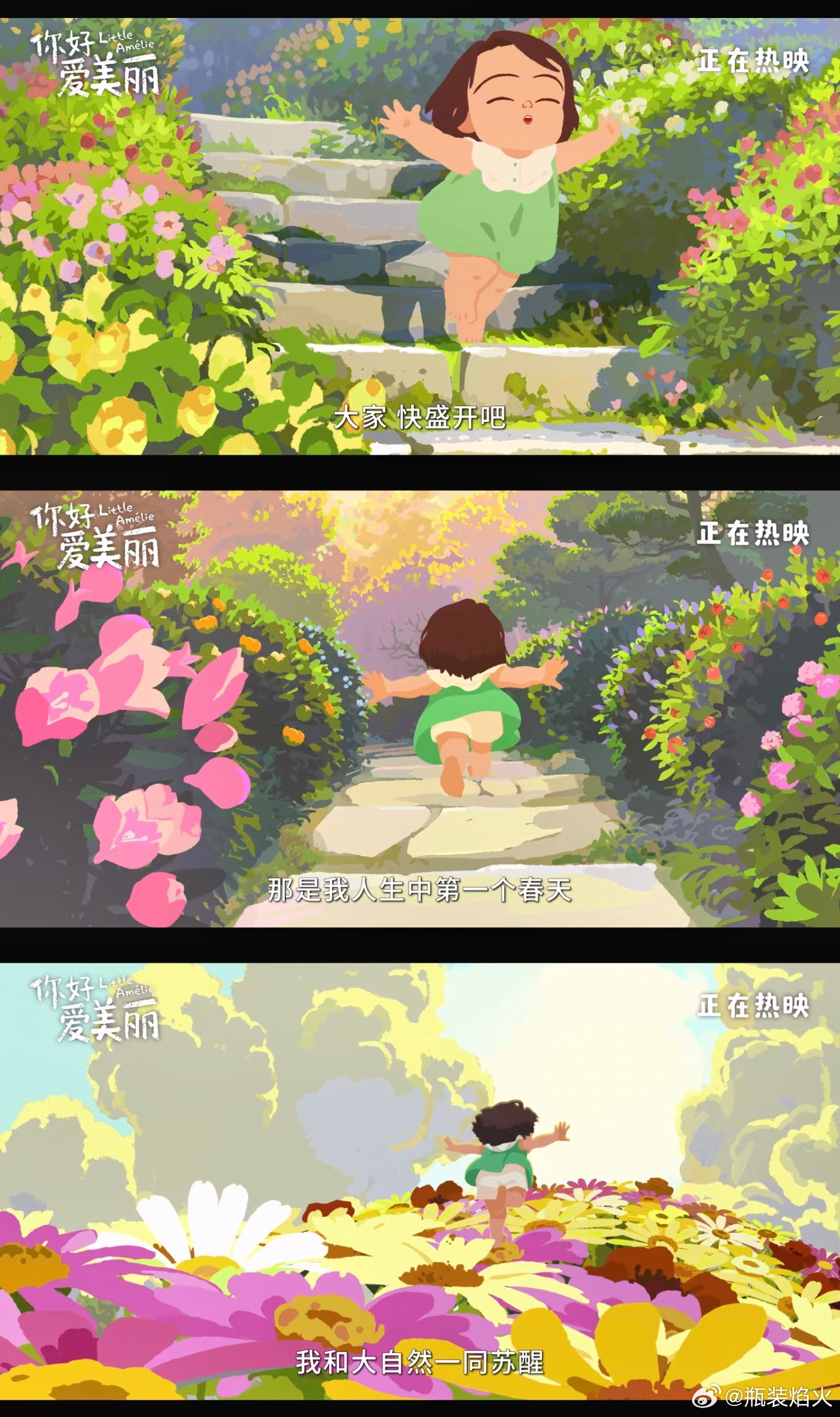 你好爱美丽今日上映 我太喜欢坐在影院里完全沉浸于《你好,爱美丽》这样的动画的感觉了,舒适、放空、治愈、慰籍,像得到了一个心灵拥抱,真的如同在精神层面被带到了一个美不胜收的世界中。这部电影给了我一个从未想过的视角,完全代入到一个婴儿的生命体验里,去逐渐构建起对这个世界的认知。重新去仔细感受行走、奔跑,触摸雾、雨、风和春天,逐渐明白性别是什么,亲情是什么,爱是什么,恨是什么,死亡是什么,记忆是什么……诸如此类影片全有涉猎,仿佛我也在从新认识这个世界。而且主创没有赋予小女主一个常规无知到有知的设定,反倒让她以为自己是全知全能的,有一套属于自己对于这个世界的独特理解方式,这太有意思了。看着看着我就忍不住开始思考,我的世界观是不是也是这样一点点被塑造而成的,而那些我们被后天雕琢出的认知,是否就是全然正确的?这真的是一部好适合春天的电影,处处充满了生机,是倔强生长的那种生命力。《你好,爱美丽》带有浓烈手绘质感的画风也和主题非常适配,每一帧都像是制作精美的绘本,天然会让人看着感觉心里暖洋洋的。看完电影我更加理解了这个片名,“爱美丽”在我心中不再只是女主的名字,它成为了我们每个人对这世界上美好事物向往的表现,“美丽”是个很广阔的词汇,爱美丽是爱世界也是爱自己。总而言之,《你好,爱美丽》是部特别美丽的电影,我爱惨!爱美丽治愈了我的精神内耗