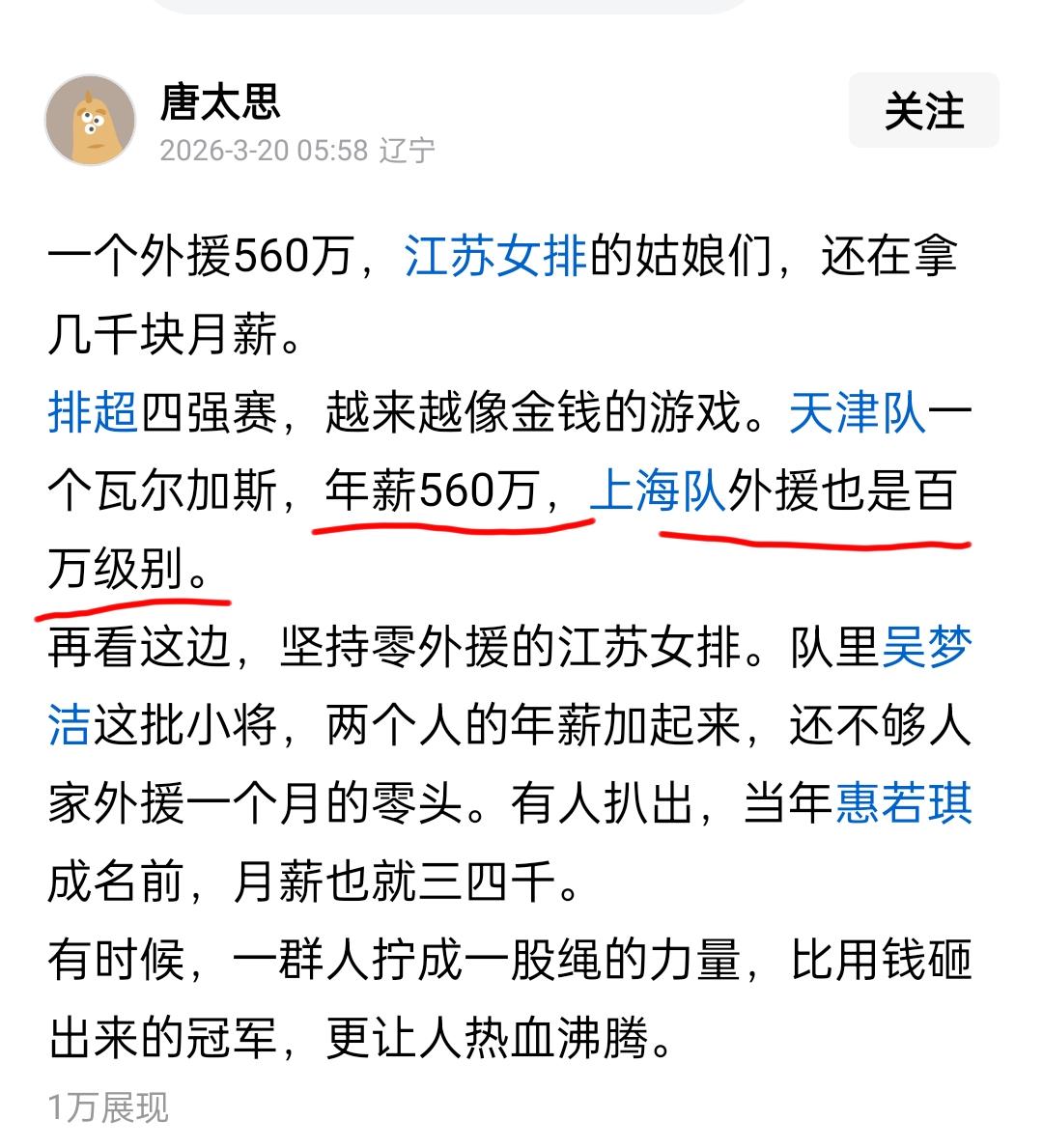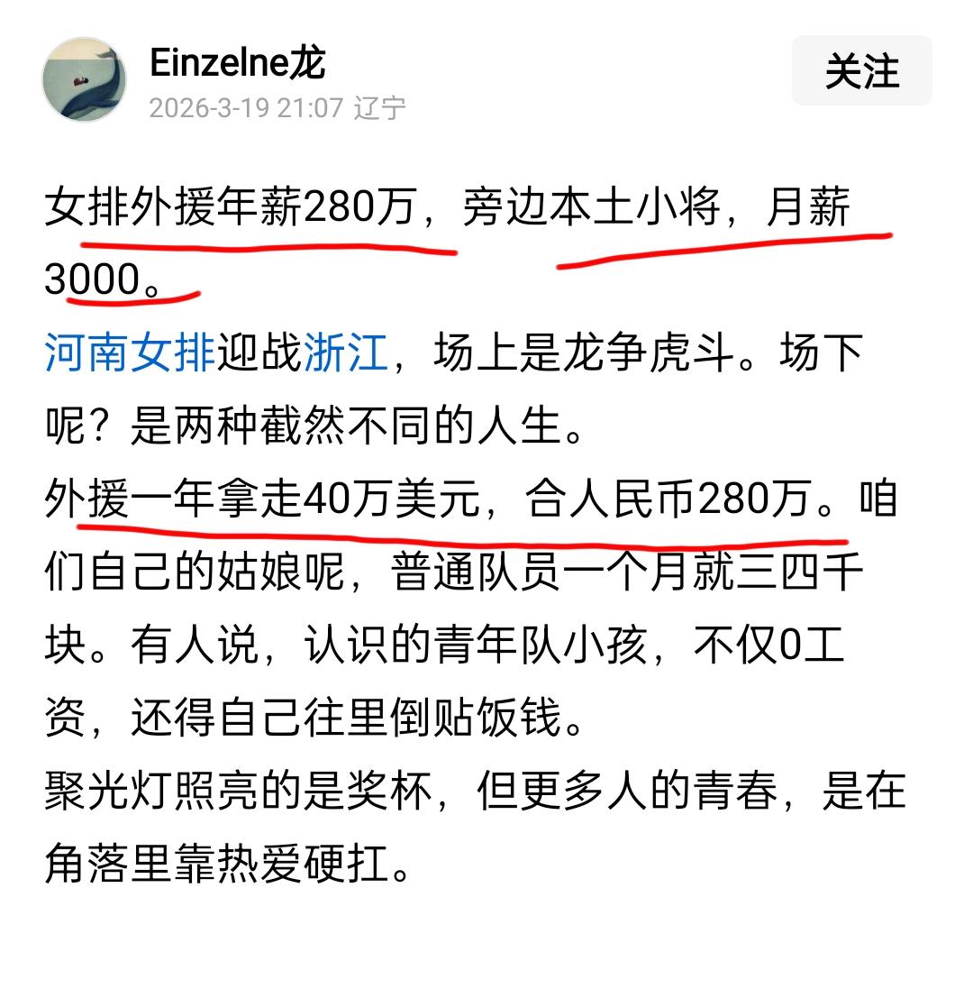 即使江苏女排不能卫冕本赛季联赛冠军,会影响江苏女排队员进国家队吗? 2025~2026中国女子排球超级联赛已经接近尾声,半决赛已经打过一轮。联赛结束之后,中国女排主教练赵勇将组织开展备战2026世联赛集训。有人担心江苏女排如果卫冕冠军失败,吴梦洁、唐欣、倪非凡等五大国手是否进国家集训队?笔者认为这担心显然是多余的。 从目前的情况来看,花数百万元买外援的队明显强于全华班的俱乐部队,天津女排、上海女排都买了两个人,比赛时也基本上靠这些外援在场上拿分,在赢球光环的背后,本土球员的实力没有多大提高;本土年轻队员只能在旁边鼓掌拍手,显然对于国家女排人才战略没有任何帮助。有球迷称,河南女排买一个范加克也需要40万美元,折合人民币280万,天津女排买一个瓦尔加斯需要560万元人民币。这钱,如果是俱乐部队靠自己票房赚来的,无可厚非;如果是靠财政补贴花纳税人的钱,笔者认为这是非常不妥的。 实事求是说,花这么多钱买外援满足一时的虚荣心,比起把这笔钱投入抓青训,几乎没有什么意义。因此,无论是总局还是排球管理中心,作为人才使用导向,进入国家队的队员应该还是在全华班队里选择,像山东的小将李晨瑄、江苏小将郭中楠等大概率会进入2026年中国女排集训队,至于董禹含,崽儿认为她进国家队的希望渺茫。 值得一提的是,即使天津女排这次拿到了联赛冠军,路晶、李响、刘敏乔、陈鹤心等年轻队员,以及正在某民营机构康复治疗的、步履蹒跚的李盈莹,大概率进不了国家队,天津女排仍然只有王媛媛一棵独苗的可能性大。 女排联赛 天津 江苏 上海 福建 山东 河南