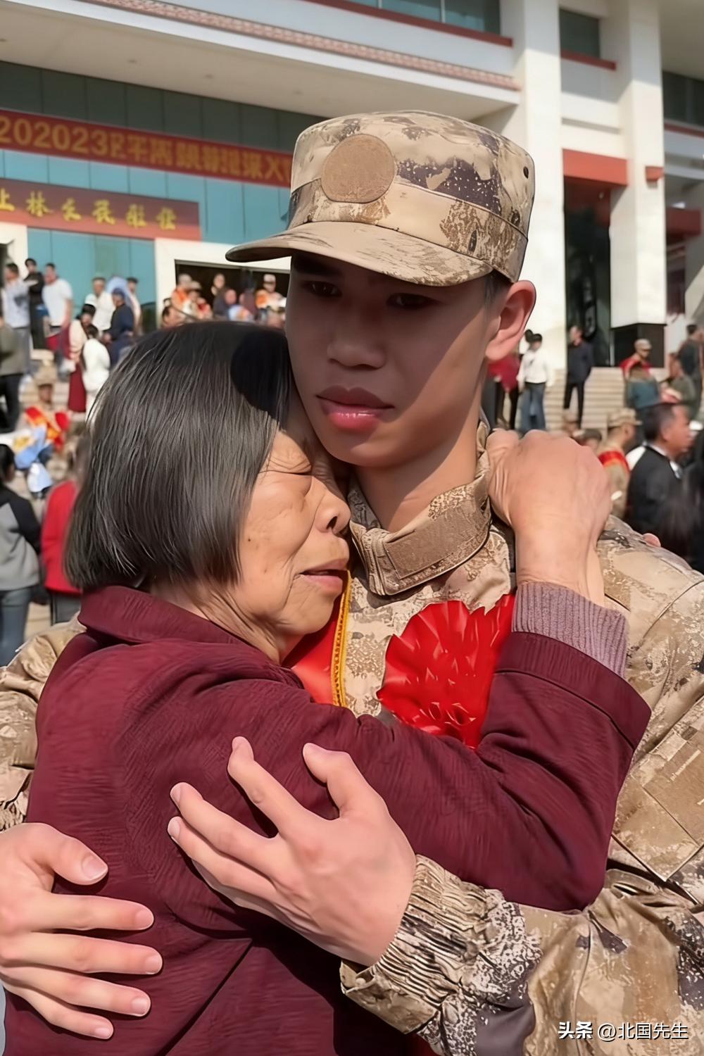 新兵,从“家里的孩子”到“国家的战士”。 身着迷彩服,佩戴大红花, 紧紧拥抱年迈的奶奶, 老人满脸不舍,将脸埋在孙儿肩头, 眼神里满是牵挂。 这是新兵入伍的欢送现场, 也是新兵家庭的缩影, 万般的不舍,终有一别。 这一身军装,这一朵大红花, 便是最动容的家国情怀。