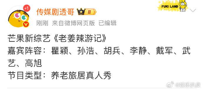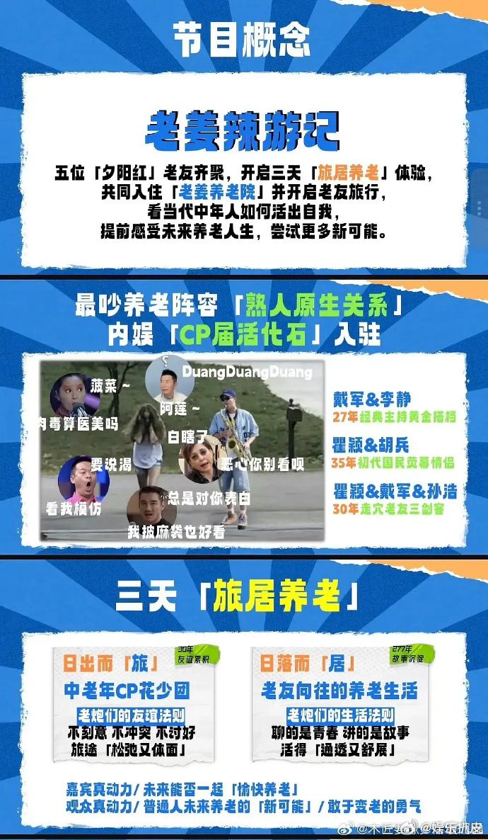 网传老姜辣游记嘉宾阵容老姜辣游记网传《老姜辣游记》嘉宾阵容。瞿颖、孙浩、胡兵、李静、戴军、武艺、高旭。芒果太会跟潮流了,速度很快!这综艺很难不好看吧,期待官宣!