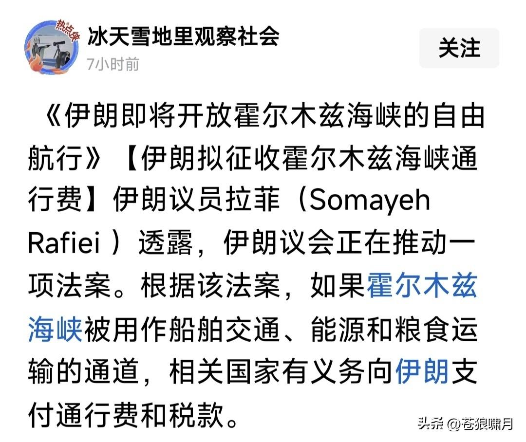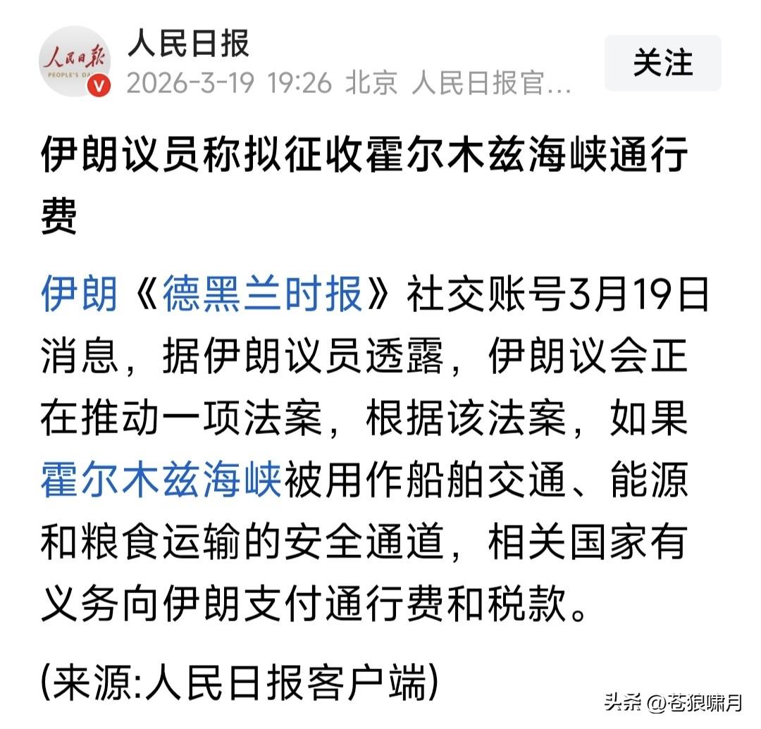 事情反转!英法德意荷日发表声明,将共同保障霍尔木兹海峡通行安全! 什么意思?此前各国不是声称,不准备出兵保护霍尔木兹海峡安全吗?这么快就变卦了?是否川普威胁奏效了? 昨日看央视报道,川普对北约国家与日韩澳等,不愿帮助美国维护霍尔木兹海峡畅通,威胁要退出北约,减少在日韩等国驻军,他们是否感到害怕了? 要知道老美是北约“老大”!有老美在北约,鹅熊首先忌惮三分,若老美退出,欧洲国家谁敢和鹅熊单挑?鹅熊还会把北约放在眼里吗?大概率不会吧? 还有日韩等国,有老美驻军在,半岛北方就不敢造次,背后老板“鹅熊”也不敢找事!若美军撤出,会否会出事? 因此这些国家,一看老特发怒,立马顾软表态:愿共同行动,保障霍尔木兹海峡运输安全。尤其高市早苗,还专门跑到美国,与川普方面交流!何意? 奇怪了!欧亚6国刚表态,伊朗媒体就发消息:伊朗将开放霍尔木兹海峡自由航行,但要对过往船只征收通行费!什么意思?妥协了吗?还扭扭捏捏? 苍狼不知过去,伊朗是否对霍尔木兹海峡船只收费?但这次似乎要收?也许有的收,有的不收?或许收费标准不同?不管怎样,只要让安全通过就行! 关键问题是,伊朗议会最新表态,与此前伊朗高层:“海峡能否安全,伊朗说了算”的表态,有点不太相同啊!应该是释放“和解”信号!但美以会认吗? 美以不仅要求霍尔木兹海峡通行安全。川普还想要求,伊朗同意“三个条件”!尼亚胡还想要,伊朗更换“教士神权”!伊朗会答应吗?目前似乎不会吧? 怎么办?继续看!据悉美以定的计划,是持续行动5周,现在才2周多一点,刚一半时间呢!往后局势如何发展?谁能预测得了?只能慢慢往后看吧! …………