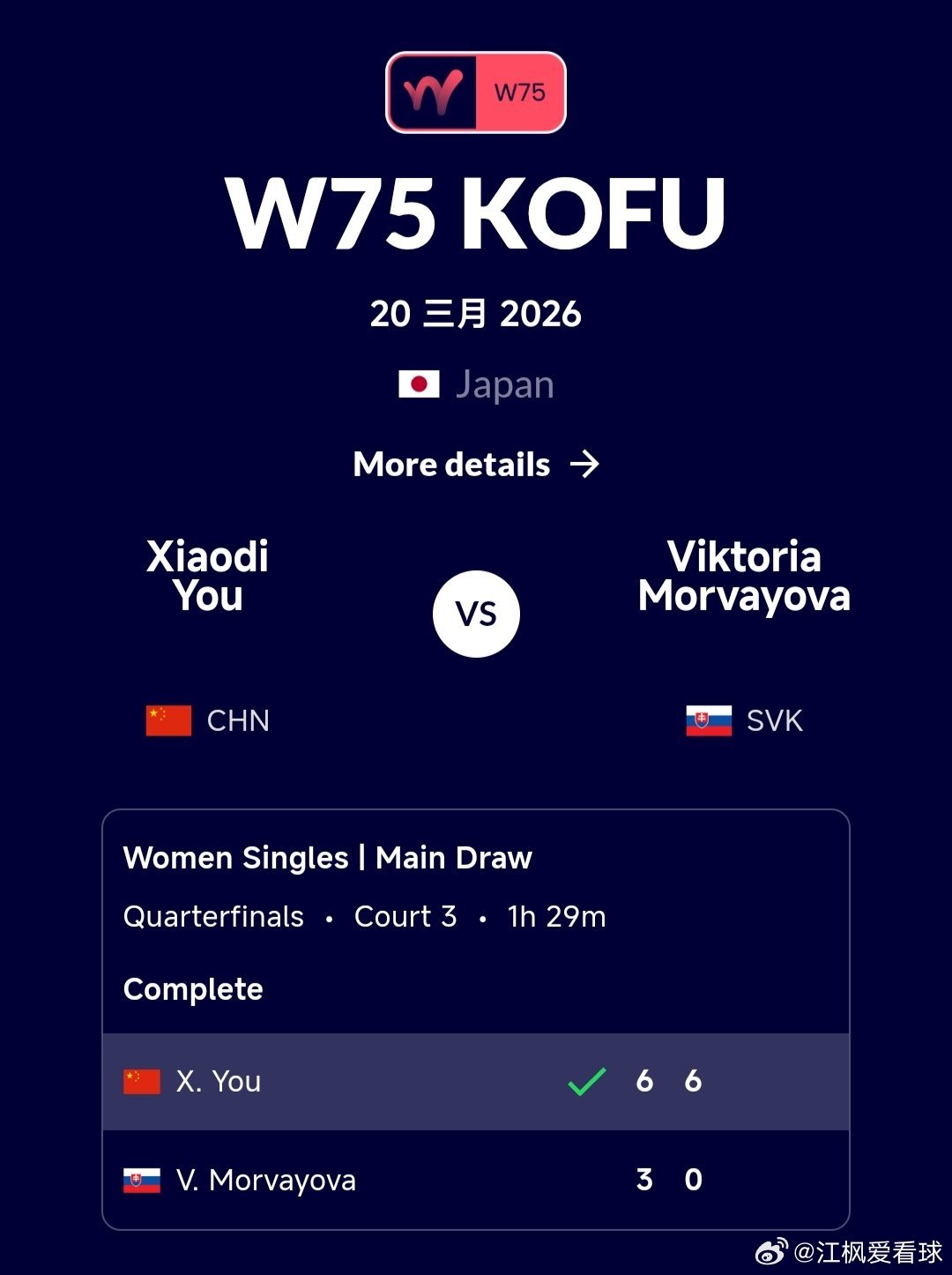 尤晓迪🇨🇳6-3/6-0战胜摩尔瓦约娃🇸🇰,晋级半决赛,恭喜尤晓迪!🎉🎉🎉