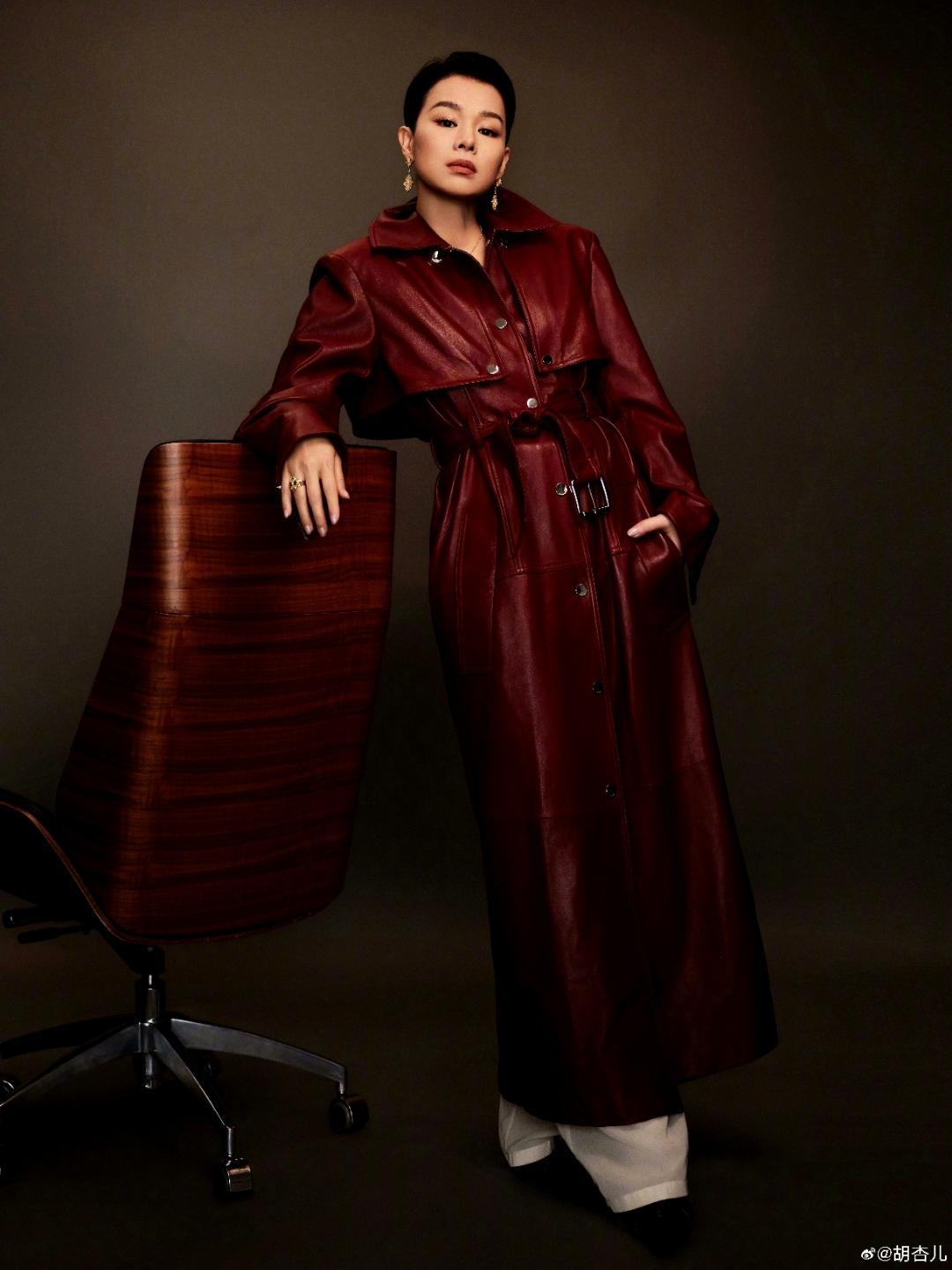 ✨胡杏儿|酒红皮风衣里的利落与温柔 利落超短发搭配酒红长款皮风衣,硬朗廓形被腰间系带巧妙收束,衬得身姿挺拔又不失女性柔美。金色珠宝点缀耳畔与指尖,在暗调背景里泛着温润光泽,每一个眼神都藏着岁月沉淀的从容与力量。