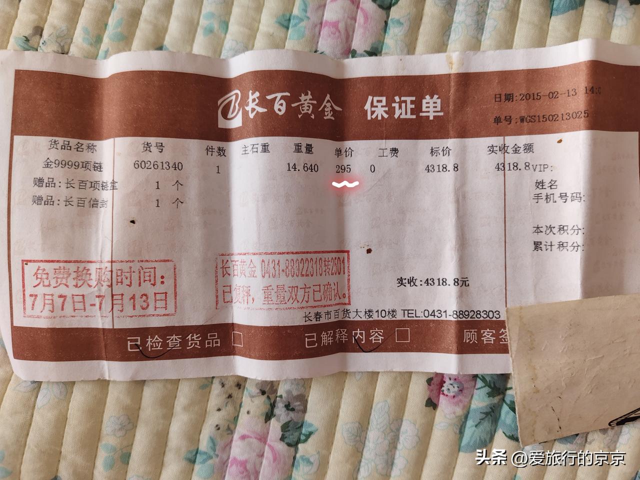 如果重回这个价格,你买不买? 收拾东西,发现了这张发票,2015年的,那时候的金价和现在的价格比,那是差了好多... 如果再有这个价格,你买还买不买呢?