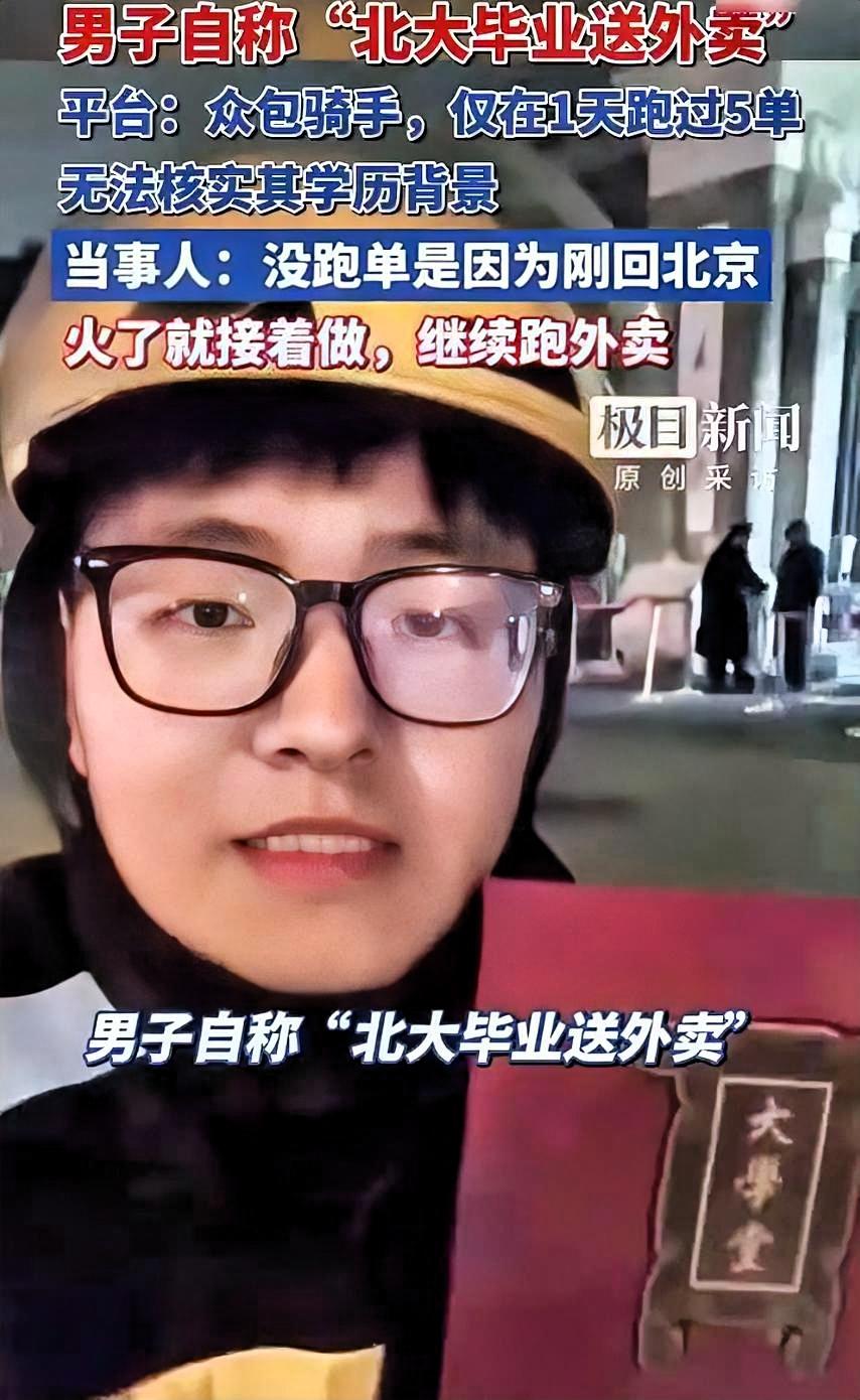 北大毕业男子回应送外卖原因:工资低的看不上,工资高的不要我。这句话戳中了不少人的就业焦虑,可随着事件发酵,真相却狠狠打了流量套路的脸。这位自称北大社会学毕业、高考660分的陶文俊,靠着“名校毕业送外卖”的悲情叙事迅速走红,可美团官方的核查结果,直接戳破了精心包装的谎言。 平台数据显示,陶文俊在2025年12月初注册众包骑手,仅12月9日当天完成5单配送,之后长达三个多月没有任何跑单记录,所谓全职送外卖谋生,完全是博取关注的人设。他在视频里把失业归咎于专业不好、零实习、眼高手低,精准踩中大众对学历贬值、就业困难的焦虑情绪,甚至坦言看到别人走红才刻意发布视频,爆火后还打算继续打造这个人设。 职业本无高低,名校毕业生选择体力劳动本无可厚非,可拿着北大光环做流量道具,消费公众的共情与善意,就变了味道。这早已不是个例,从“清华博士送外卖”到如今的北大外卖哥,套路如出一辙:用高学历与基层职业的强烈反差制造话题,靠贩卖焦虑收割流量,最后被平台数据戳穿后草草删视频收场。 这种行为不仅消费了外卖骑手群体的真实辛劳,也扭曲了学历与职业的理性认知,更消耗了社会最珍贵的善意。流量时代,我们更该保持清醒,别被刻意制造的焦虑带偏,也别让虚假人设透支了人与人之间的信任。真正值得关注的,是脚踏实地的生活与真实的就业困境,而非这种精心编排的流量闹剧。 对于这种名校人设博流量的行为,你觉得该如何抵制?