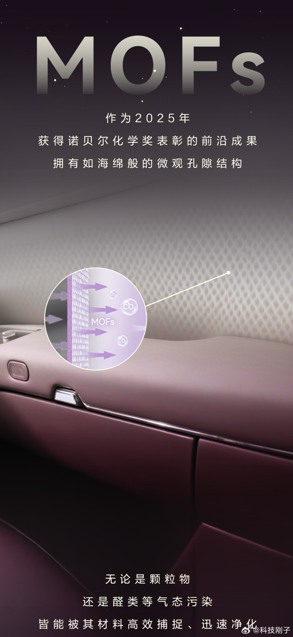 从顶棚到门板,MOFs材料遍布全车,搭配UVC+MOFs抗菌滤芯,实现24小时持续净化:10分钟降服火山喷发级PM2.5,20分钟把重度甲醛污染的密闭空间净化到安全级。更有车载制氧机、动态迎宾光毯、二排旋转座椅等科技配置加持,让每一次出行都像住进会呼吸的健康行宫,用全维实力定义MPV科技车皇。智界V9诺贝尔奖材料MOFs上车