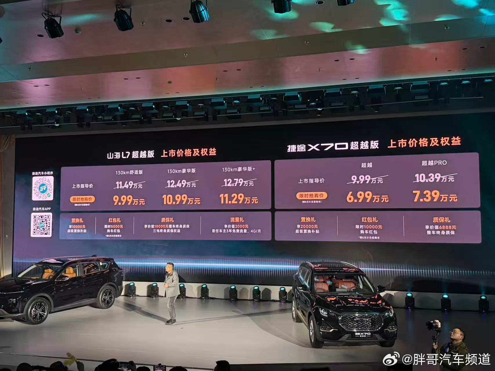 胖哥汽车频道 2026款捷途X70/山海L7超越版上市。2026款捷途X70超越版共推出两款车型,售价区间为9.99-10.39万元;2026款山海L7超越版共推出三款车型,售价区间为11.49-12.79万元。捷途X70捷途旅行小房车春季焕新发布会