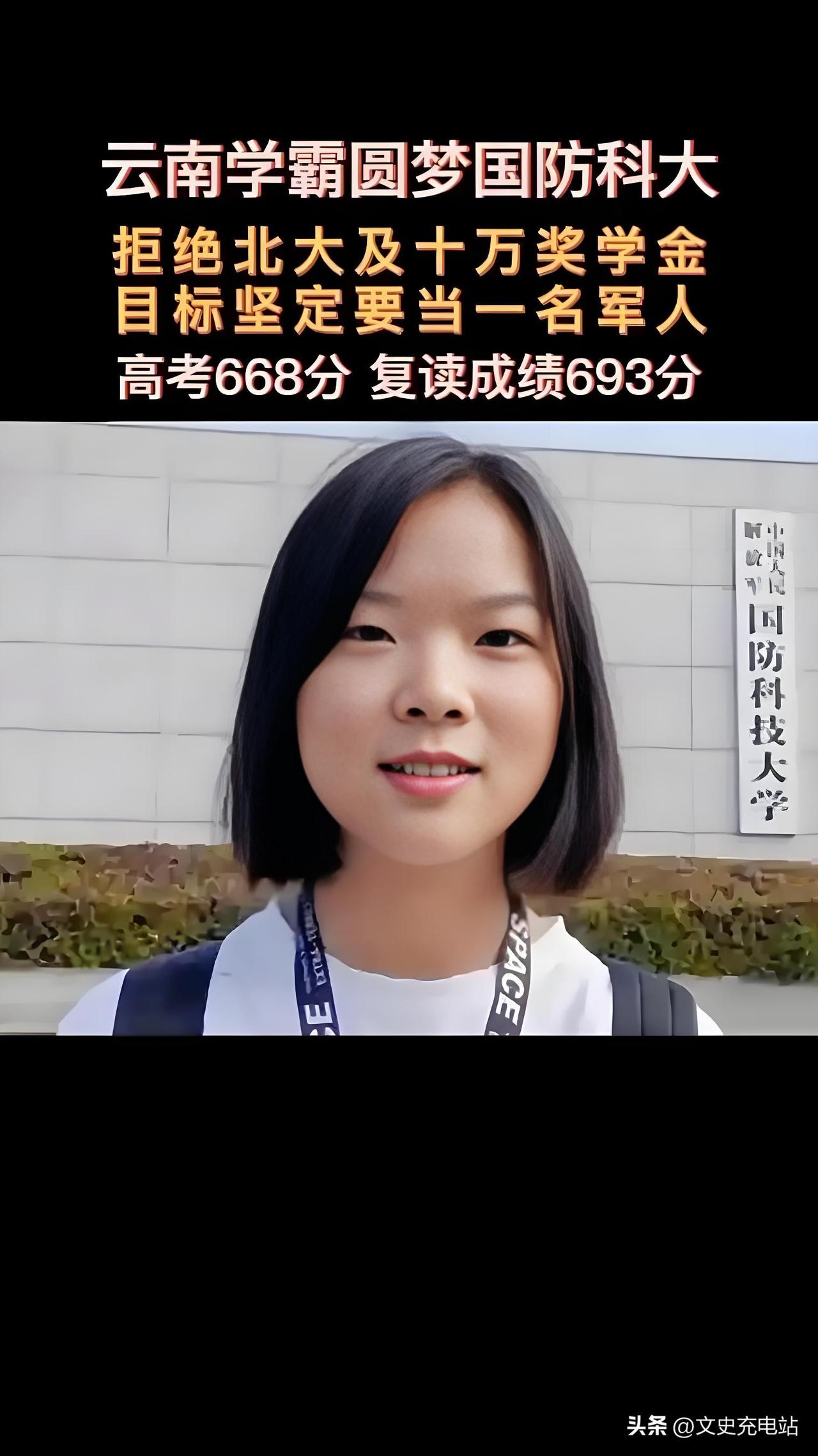 2019年,云南女孩因1分之差,无缘国防科技大学。她一咬牙:“我要复读,再考!”次年,她考出693高分,北大向她开出条件:来我校,给你10万奖学金!她却摇头:不,我要上国防科技大学![太阳] 在云南,有一位名叫李盈的女孩,她婉拒了北京大学医学部提出的10万元奖学金邀约......要知道那是国内顶尖学府北大,那么她为何坚定拒绝? 2019年,她高考取得668分的好成绩,这一分数让很多同龄人羡慕。 可李盈的唯一目标是国防科技大学,那年,国防科大在云南仅招收两名女生,李盈位列第三,与第二名分差仅1分,遗憾错过了心仪的军校。 面对这个结果,李盈没有选择用已有的高分进入其他著名高校,而是决定复读一年。 她周围的亲友建议她务实些,凭这个成绩上个好大学同样未来可期,但她的心始终向往军装和军营生活的意义。 这一年复读中,李盈制定了严格的学习计划,固定时间攻克重点科目,同时为适配军校要求,坚持针对性体能训练,兼顾学业与身体素质提升。 她深知,成为合格军人不仅需要优秀的学业成绩,更需要过硬的身体素质。 2020年,她以693分刷新了自己成绩,全方位提升的努力终于得到了回报。 紧接着,北京大学医学部招生组向她发出邀约,提出可协助申请10万元奖学金,诚意招揽她入学。 这笔资金对于她的家庭来说,无疑能够解决大学期间的大部分经济压力。 尽管如此,李盈并没有动摇,她再次选择了国防科技大学。 李盈自幼对军人怀有崇敬之情,向往军营与迷彩军装,这份纯粹的热爱,早早埋下了她从军报国、服务祖国的决心。 进入军校后,她没有轻言放松。 她严格遵守军校作息,生活规律自律,学习期间刻苦钻研,主动参与科研相关学习与实践,学业成绩突出,多次获得校内各类奖励与奖学金。 靠着军校的津贴和学业奖励,李盈逐渐缓解了家庭的经济压力,用实际成绩告诉所有人,她的选择并非盲目,而是有根基、有远见的坚持。 李盈的经历并非简单的逆袭,她的故事更像是一个年轻人面对抉择时,坚守内心热情的表现。 放弃光环和金钱诱惑,选择心底的梦想,无论过程多么曲折,最终都能激发出潜藏的力量,走出一条属于自己的道路。 在我们身边,仍有许多人因怀揣目标而持续努力,无论科研实验室里的学者,还是车间里专注技术的工匠,他们都在以各自方式展现着专注和执着。 正是这种发自内心的追求,使他们能在领域中积淀实力,成就感与满足感也随之而来。