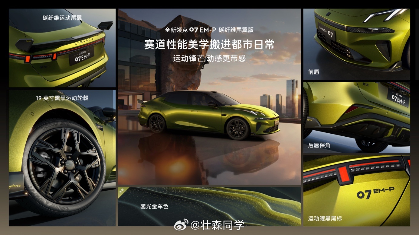 全新领克07 EM-P这次直接上强度,碳纤维尾翼版来了。不是简单加个外观件,而是从视觉到氛围都在往“赛道味”靠:碳纤维运动尾翼+鎏光金车色,再加上更有攻击性的座舱风格,这一套下来,真的有点都市性能玩家那味儿了,开在路上辨识度直接拉满。