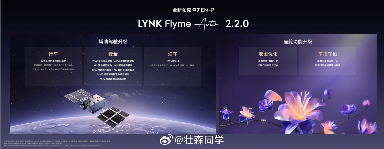 但重点不止是好看,这次还把智能这块补齐了。官方已经确认,第二季度会给搭载千里浩瀚H7方案的07推送LYNK Flyme Auto 2.2.0,直接解锁D2D车位到车位领航辅助。简单说就是,从停车位到目的地停车位,一条龙帮你搞定,真正把“全场景智能出行”这件事落地。