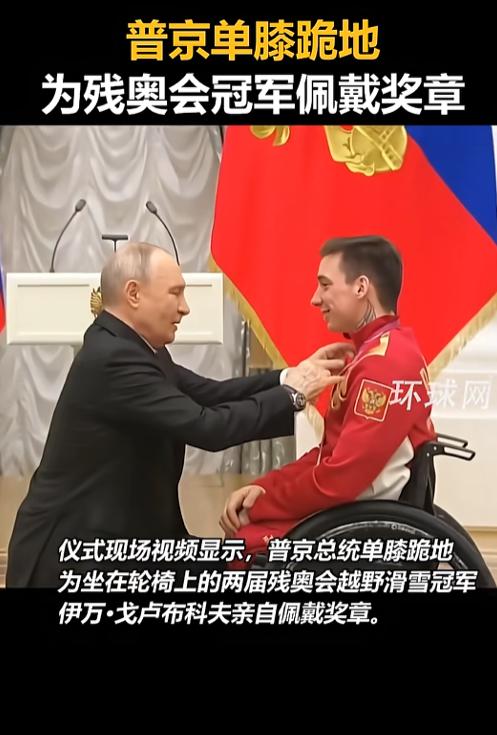 普京单膝跪地为轮椅残奥冠军亲手戴勋章,克里姆林宫这一幕直接看暖了,一个毫无刻意的简单动作藏着细节里最动人的尊重与温柔。 3月19日俄罗斯为残奥健儿举办了一场特别的授勋仪式,普京亲自到场为出征意大利残奥会的本国运动员和教练员颁发国家级的“友谊勋章”,既是嘉奖他们在赛场上取得的好成绩,更是致敬这群人骨子里那股不服输、不放弃的劲儿。 仪式上两届残奥会越野滑雪冠军伊万·戈卢布科夫坐着轮椅来到台前,接下来的画面让所有人动容。 普京没有喊工作人员帮忙代劳,也没有居高临下地随便把勋章递过去,而是慢慢单膝跪地和轮椅上的伊万平视相对,亲手把勋章认认真真别在他胸前,动作轻缓又郑重,眼里满是对这位运动员的肯定和赞赏。 谁都知道残奥运动员的赛场之路有多难。 他们带着身体的缺憾要比普通人付出百倍千倍的努力,在雪道上一次次挑战、一次次冲刺才为国家拼下了亮眼的成绩。 这份拼劲和坚韧就应该得到最高规格的礼遇。 而普京的动作从来不是放下身份,而是对努力的人最真诚的尊重是对每一个为梦想拼尽全力的人的极致尊重。 其实感动的不只是隆重的排场,而是这样暖心的小举动。 一个简单的跪地动作胜过太多话,让我们真切感受到真正的尊重从不是高高在上的关照,而是放下姿态的平视。 不管是谁只要为了目标用尽全力、努力,就值得被善良对待,这也是这一幕能火遍全网,让无数人动容的真正原因。 信息来源:环球网《普京单膝跪地,为残奥会冠军佩戴奖章》2026-3-20