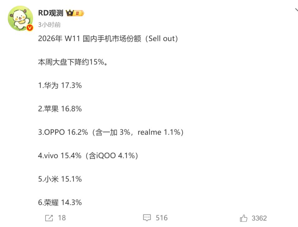 花果争霸成常态,华为连续2周超苹果排名第一,小米第五很稳 进入2026年,国内手机市场格局发生变化,华为和苹果的市场份额大幅提升,上演花果争霸的局面;线下双雄OPPO和vivo依托强大的线下渠道,虽然没有和苹果、华为争前二的能力,但稳守第三、第四位置游刃有余;小米则跌至第五,荣耀继续排名第六。 近几周以来,华为和苹果轮流登顶周销量榜首,W10华为反超苹果登顶第一,W11华为再次蝉联第一,以17.3%的市场份额排名第一,苹果以16.8%紧随其后,OPPO以16.2%的市场份额排名第三,vivo以15.4%的份额排名第四,小米以15.1%的市场份额排名第五,荣耀以14.3%的市场份额排名第六。 受内存和存储芯片价格上涨的影响,以中低端为主的安卓阵营面临巨大成本压力,目前OPPO、vivo和荣耀部分机型已涨价,小米预估近期跟进涨价。华为和苹果都以高端手机为主,手机均价高,抗成本压力能力更强,暂不跟进涨价。 在安卓纷纷涨价的前提下,华为和苹果的竞争优势凸显,霸榜前二自然成了常态。