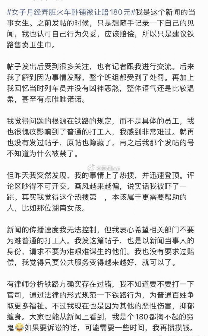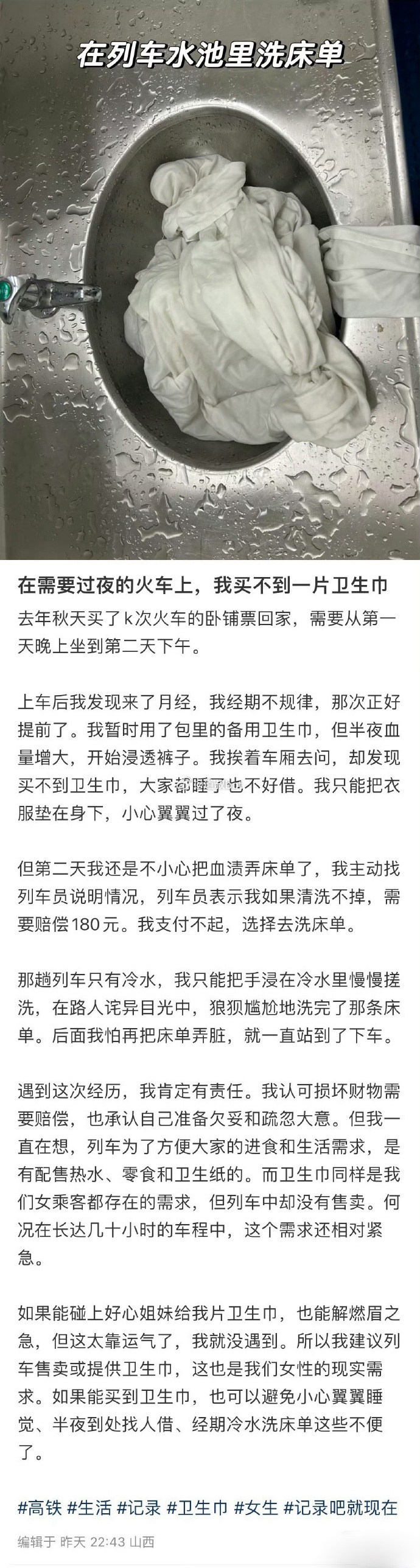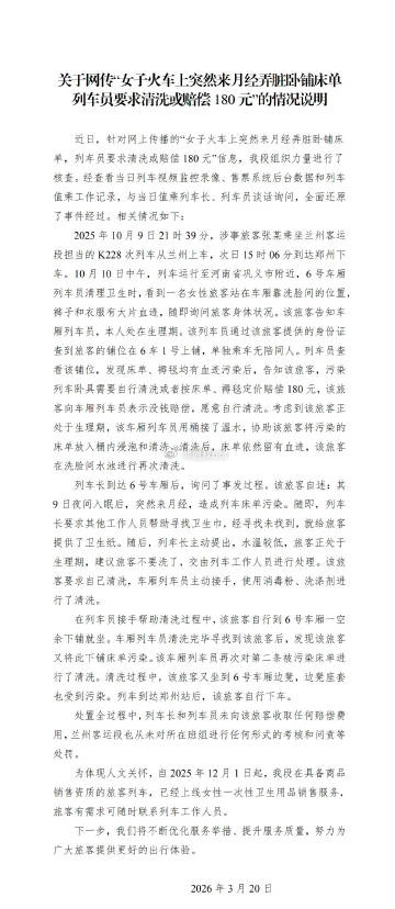 网友发帖,自己乘坐兰州铁路局K228次火车卧铺时因月经突然来临,车上买不到卫生巾,不慎弄脏床单,被工作人员要求自行清洗干净或赔偿180元,随后她呼吁火车上应售卖卫生巾,引发热议。事发于2025年10月9日,她乘坐兰州铁路局K228次列车,全程十多个小时,需在卧铺上过夜,过了大半年才发帖,是因为最近才想起来。