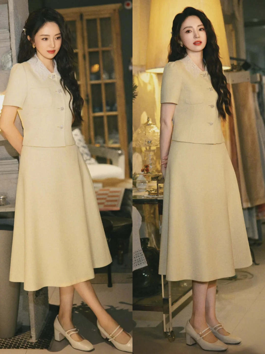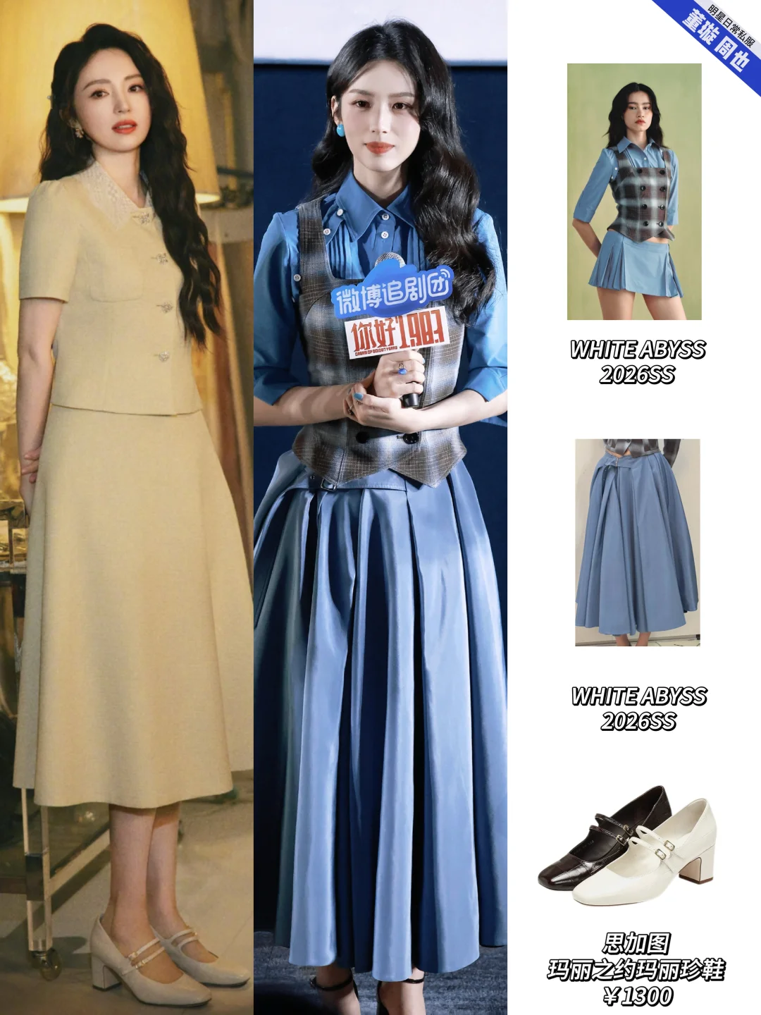 周也董璇《你好1983》追剧团同框,她们都用复古风裙装搭配玛丽珍鞋,复古优雅的母女组!