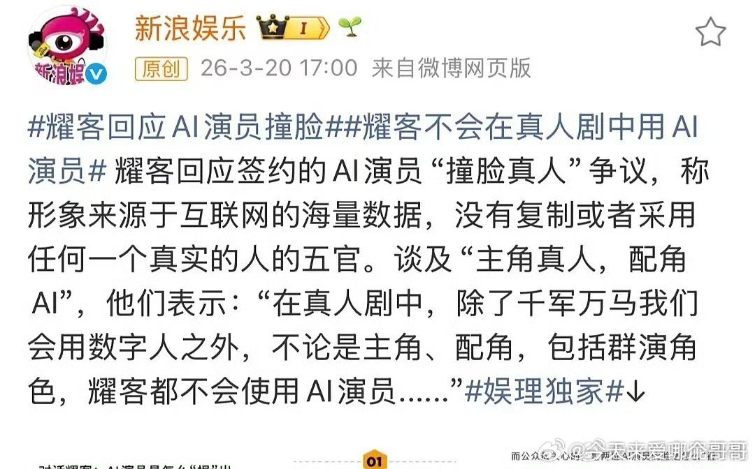 耀客滑跪了,承诺不会在真人剧里用ai演员
