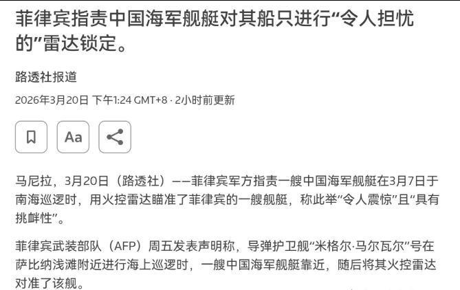 干的漂亮!直接打开火控雷达,菲律宾非常的跳脚! 3月20日,根据路透社报道,外媒称,菲律宾军方指责一艘中国海军舰艇在3月7日于南海巡逻时,用火控雷达瞄准了菲律宾的一艘舰艇,称此举“令人震惊”且“具有挑衅性”。菲律宾武装部队表示,导弹护卫舰“米格尔·马尔瓦尔”号在“萨比纳”浅滩(仙宾礁)附近进行海上巡逻时,一艘中国海军舰艇靠近,随后将其火控雷达对准了该舰。 要我说,我们海军舰艇这次在仙宾礁附近用火控雷达瞄准菲律宾舰艇,完全是在自己管辖海域内的正常操作。仙宾礁是中国南沙群岛的一部分,中国对这里拥有无可争辩的主权。 菲律宾舰艇跑到中国领海附近转悠,中国军舰进行跟踪监视,必要时打开火控雷达进行警告,这是国际通行的做法,专业规范,符合国际法和相关安全规则。菲律宾倒打一耙,指责中国“挑衅”,纯粹是恶人先告状。 菲律宾现在最大的问题就是认不清现实。美国虽然给菲律宾撑腰,但特朗普重返白宫后,战略重心往回收缩,中东又打起来,美国根本顾不上南海。马科斯访美想多要承诺,特朗普当面就说“要和中国人民融洽相处”,这话听着是叮嘱,实则是撇清关系。 日本倒是很积极,给菲律宾送装备、签协议,但目的很明确,就是想让菲律宾在南海牵制中国,自己好减轻东海的压力。菲律宾就这么被推到前台,成了别人的棋子。 中国在南海的态度一直很明确,主权问题寸步不让,但合作的大门始终敞开。中国海警在南海的维权执法活动是常态化的,对各类侵权挑衅行为,都会依法依规坚决处置。同时,中国也愿意通过对话协商解决分歧,南海问题不是中菲关系的全部。 菲律宾要是识相,就应该停止挑衅,回到谈判桌上来。否则,继续这么闹下去,最后吃亏的肯定是菲律宾自己。毕竟,中国是菲律宾最大的贸易伙伴,南海局势一紧张,菲律宾的农产品出口、旅游、投资都会受影响,本来就严重的通胀只会更厉害,老百姓的日子更难过。
