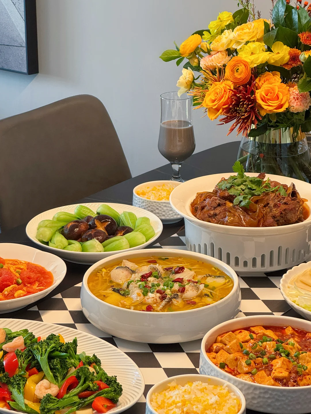 以前总觉得要赚大钱、干大事才叫厉害 直到妈妈说:把家里照顾好,也是一种了不起的本事 慢慢才懂,三餐四季 烟火人间,一家人围在一起好好吃饭就是最踏实的幸福❤️ 今日菜单: 🥢酱烧羊蝎子 🥢麻婆豆腐 🥢西兰苔炒虾仁 🥢酸菜鱼 🥢蚝油香菇油菜 🥢西红柿炒鸡蛋 🥢烤鸭