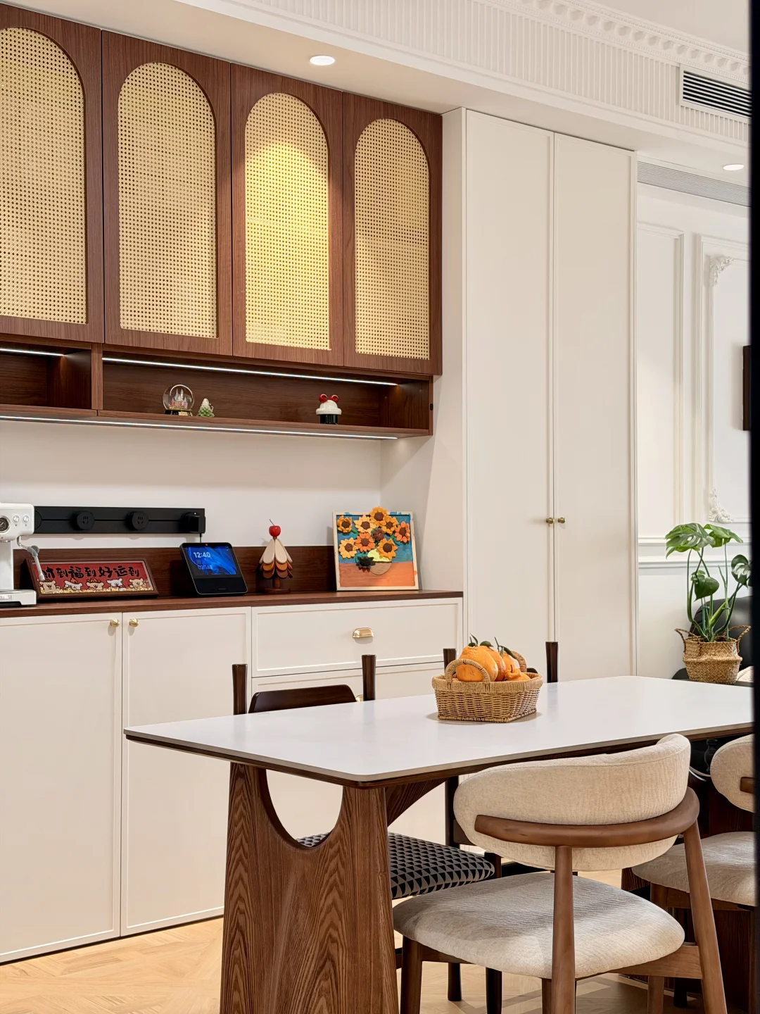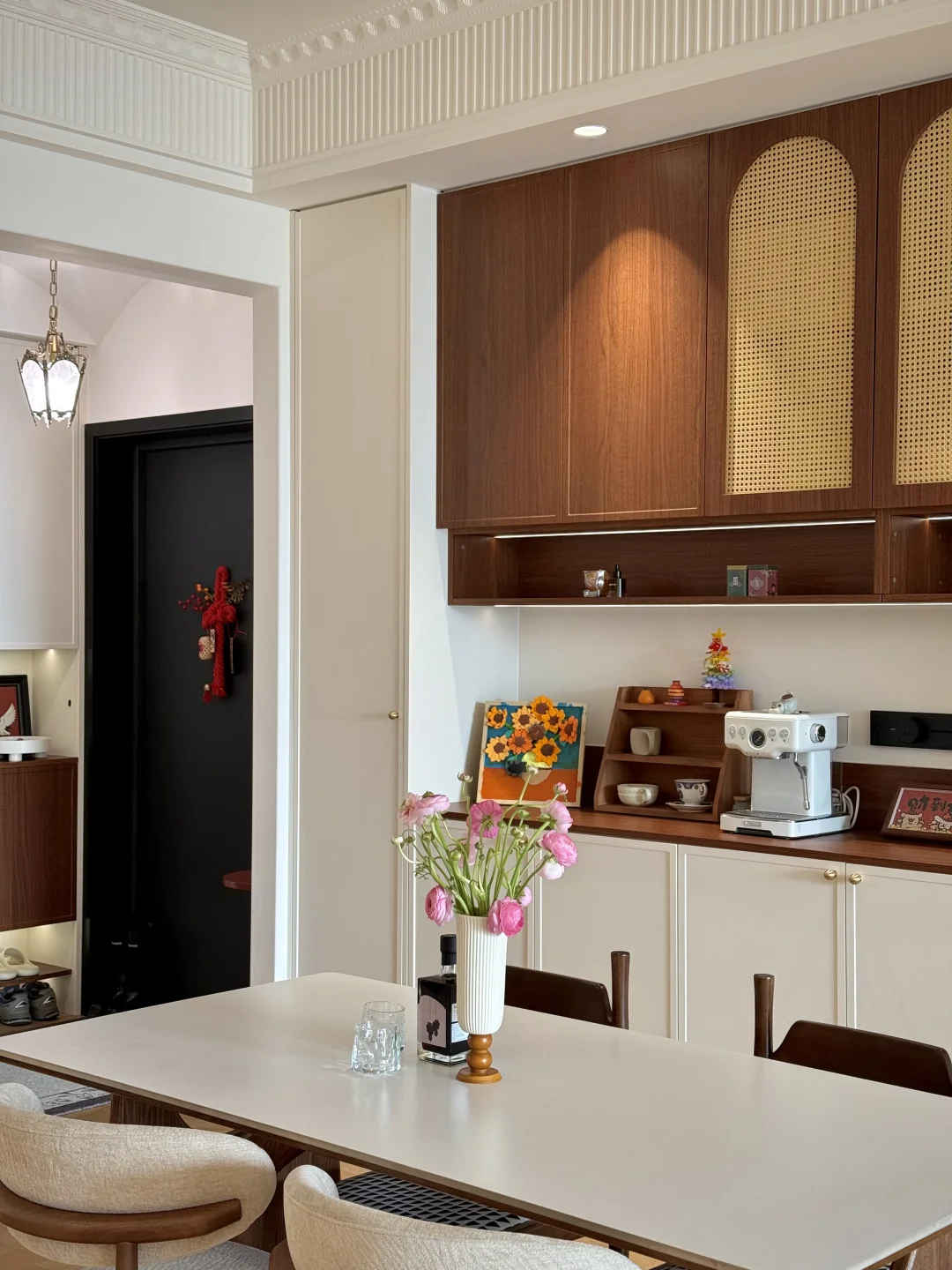 餐厅配中古风餐边柜和岩板餐桌