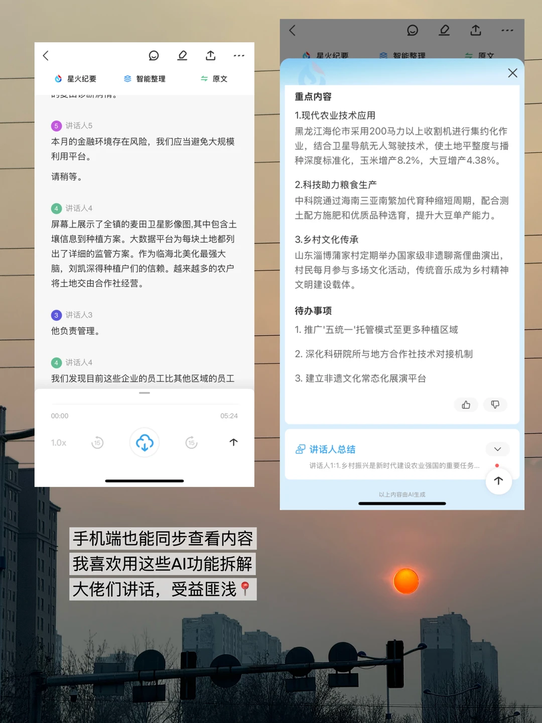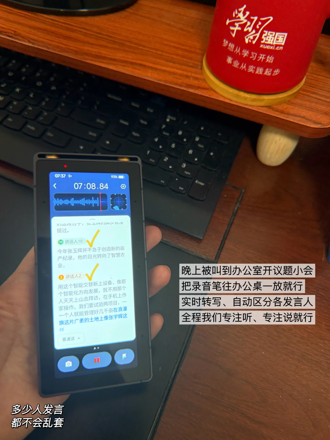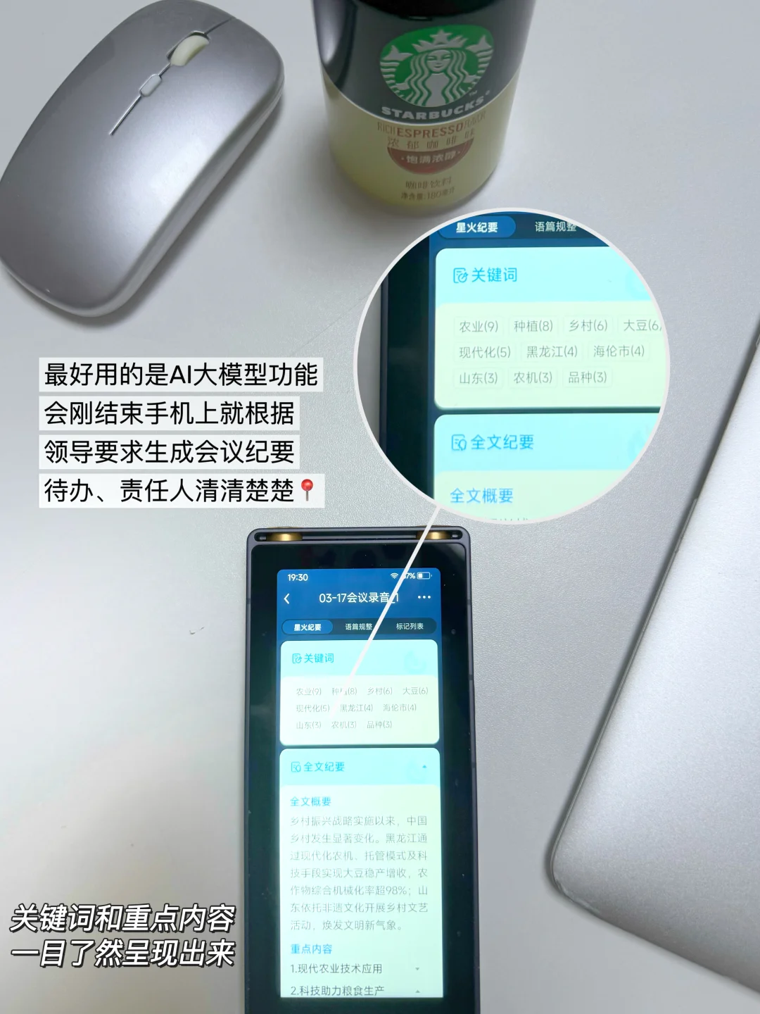 以前开会我全程奋笔疾书,记是记全了,会后整理信息又翻半天。最近在同事提议下,采购了录音笔王者—讯飞AI录音笔S6,往会议桌一放,实时转写、自动区分发言人。全程专注听、专注说就行。[电影R]最好用的是AI大模型功能:会刚结束,手机上就生成会议纪要,待办事项、责任人、时间节点清清楚楚,我爱用这些AI功能拆解大佬讲话,受益匪浅