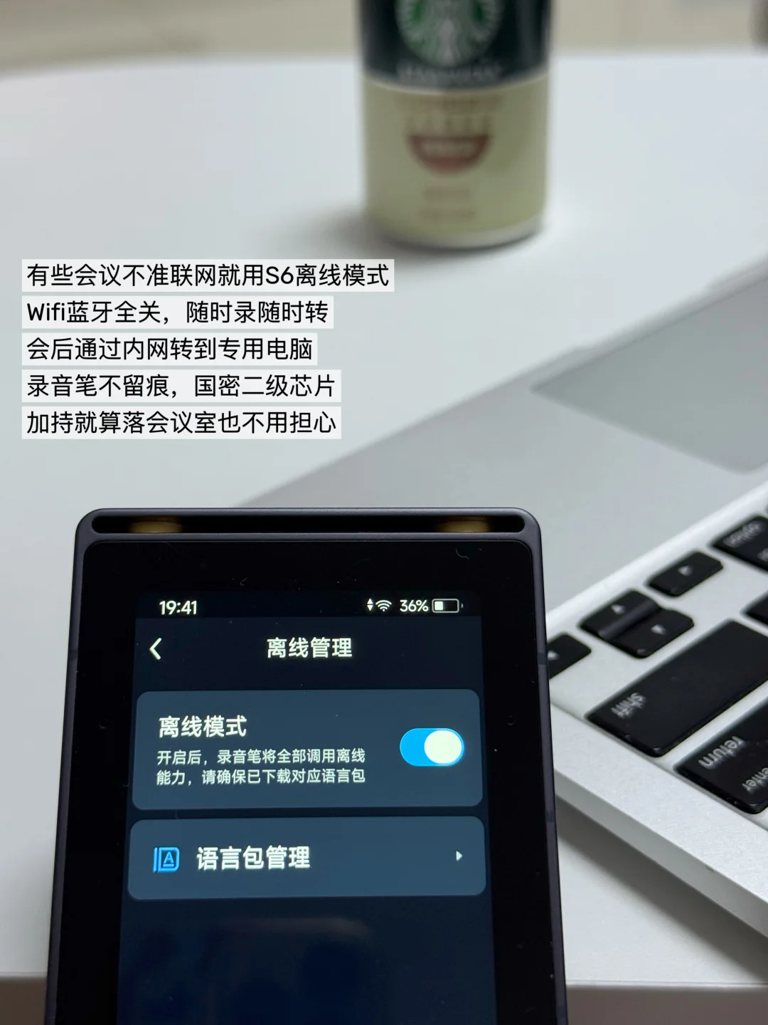 逢大型会议室坐后排也不怕,20米照样听得清晰。有些会议不带手机、不准联网,就打开S6离线模式,Wi-Fi蓝牙全关,随录随转,会后通过内网转到专用电脑,录音笔不留痕,机身配有国密二级安全芯片,国密加密加持下,文件就算落会议室也不会泄露。