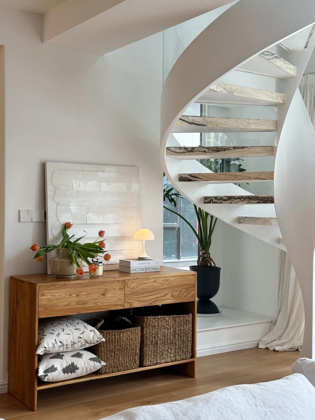 想要满足有娃家庭的照明需要 又想要北欧、法式的温馨氛围 所以我家既装了主灯,也装了筒射灯 特此声明:所有灯具均为自购无广 像客厅、餐厅、楼梯间、岛台这些地方都装了吊灯强调空间风格 然后厨卫、玄关、过道用筒射灯做无主灯设计,灯光均匀无死角 壁炉、边柜、茶几上呢在添置上各式各样的小台灯,把氛围感直接拉满 还有一些壁灯、摇臂灯或是用来装饰我家的大白墙,或是作为镜前补光 每一个都是我精挑细选 色温基本都是暖色系 除了摇壁灯会频闪 其他都还是挺满意的~
