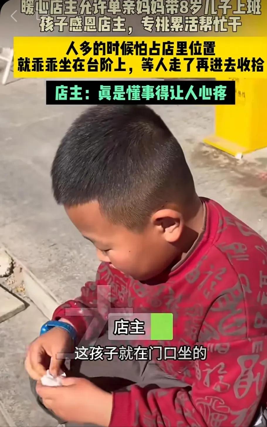 懂事到让人心疼!内蒙古呼和浩特,单亲妈妈求职处处碰壁,含泪求老板允许带娃上班,老板心软点头应允,没想到8岁儿子的一连串举动,直接让老板当场红了眼!网友:“这孩子太让人心疼,老板也是实打实的善人!” 没人能想到,一次心软的破例,竟见证了一段双向奔赴的温暖与成长。 呼市这家开了十几年的饭店,店主见过形形色色的人。 唯独一对从河北来的单亲母子,深深印在了店主的心里,想起就心疼。 现在每天傍晚,饭店打烊后,8岁的小宇都会帮店主把前厅的桌椅归位。 他踮着脚,把椅子一个个推到桌子底下,动作熟练又认真。 小宇的妈妈在一旁算账,偶尔抬头看他,眼里的温柔藏都藏不住。 谁能想到,一年前,这对母子站在饭店门口,连抬头的勇气都没有。 那天下午,天有点阴,风刮得人发冷,女人带着孩子在店外徘徊。 她犹豫了很久,才红着眼眶走进来,声音细若蚊蚋,带着恳求。 “老板,能不能让我在这干活?我带着孩子,他特别懂事,不添乱。” 店主当时皱了眉,开饭店最怕带孩子上班,忙起来根本顾不上。 可他低头,看见女人身后的小男孩,攥着妈妈的衣角,眼神怯生生的。 孩子没有哭闹,也没有乱跑,只是安安静静地站在妈妈身后,格外乖巧。 店主看着女人眼底的绝望和孩子的懂事,终究还是软了心,破例点了头。 没人知道,这对母子从河北远赴呼市,早已走投无路。 女人是单亲妈妈,独自拉扯着小宇,为了谋生,辗转了好几个城市。 她应聘过无数份工作,都因为带着孩子,被一次次拒绝。 房租逾期,学费没着落,连顿热饭都快吃不上,才鼓起勇气走进这家饭店。 小宇从第一天来饭店,就没给任何人添乱。 饭点最忙的时候,他从不吵闹,也不黏着妈妈,找个角落安静坐着。 他不玩手机,也不哭闹,要么默默看着妈妈干活,要么自己翻看随身的旧课本。 等客人走得差不多了,他就主动起身,帮着收拾桌上的碗碟。 小小的手端着浅浅的碗,动作小心翼翼,生怕摔碎,连店主都看在眼里。 有一次,饭店来了一桌客人,不小心把汤汁洒在了地上。 不等店员动手,小宇就拿着小抹布,蹲在地上一点点擦干净。 客人见状,忍不住夸奖他懂事,要给他塞零食,他却摇着头往后退。 “谢谢叔叔,我不吃,妈妈说不能随便要别人的东西。”他说得认真又腼腆。 店主看在眼里,越发心疼这个孩子,也越发照顾这对母子。 他经常留母子俩在店里吃饭,偶尔还会给小宇买文具和课外书。 小宇记在心里,每天早上都会提前来饭店,帮店主打扫卫生。 他会把门口的垃圾清理干净,把桌椅擦得一尘不染,从不偷懒。 有一次,妈妈不小心崴了脚,没法干活,只能坐在一旁休息。 小宇就学着妈妈的样子,给客人递餐具、收拾桌子,动作有模有样。 他个子不够高,就搬来小板凳垫在脚下,认真地做好每一件事。 店主劝他歇会儿,他却仰着小脸说:“我多干点,妈妈就不用那么累了。” 这句话,让店主心里一酸,也让店里的店员们格外动容。 日子一天天过去,母子俩渐渐在呼市站稳了脚跟,脸上的笑容也多了起来。 小宇的懂事,从来都不是刻意讨好,而是刻在骨子里的善良和体贴。 他从不主动要零食、要玩具,哪怕店主主动给,他也会先问过妈妈。 他会把店主给的零食省下来,留给妈妈吃,自己只吃最简单的饭菜。 有时候,妈妈加班到很晚,他就安安静静地在一旁写作业,等妈妈一起回家。 偶尔店里不忙,他会帮妈妈择菜、擦桌子,把能做的活都揽过来。 后来,有人把小宇在店里帮忙的样子拍了下来,传到了网上。 视频很快爆火,网友们纷纷留言,心疼这个懂事的小男孩,也称赞店主的善意。 如今,这对母子已经在呼市安定下来,日子慢慢有了起色。 小宇的妈妈依旧在饭店勤勤恳恳地干活,深得店主和同事的认可。 8岁的小宇,已经成了饭店里的“小帮手”,每天放学都会来店里帮忙。 他依旧那么懂事、体贴,从不任性,凡事都先想着妈妈,想着帮大家分担。 店主也早已把这对母子当成了家人,时常关心他们的生活和小宇的学习。 没有轰轰烈烈的壮举,只有细碎的温暖,藏在母子俩的一举一动里。 小宇用小小的肩膀,扛起了对妈妈的牵挂,也用懂事,温暖了身边每一个人。 这份双向奔赴的温暖,没有惊天动地,却足够治愈人心,看哭无数人。 信源:网易新闻