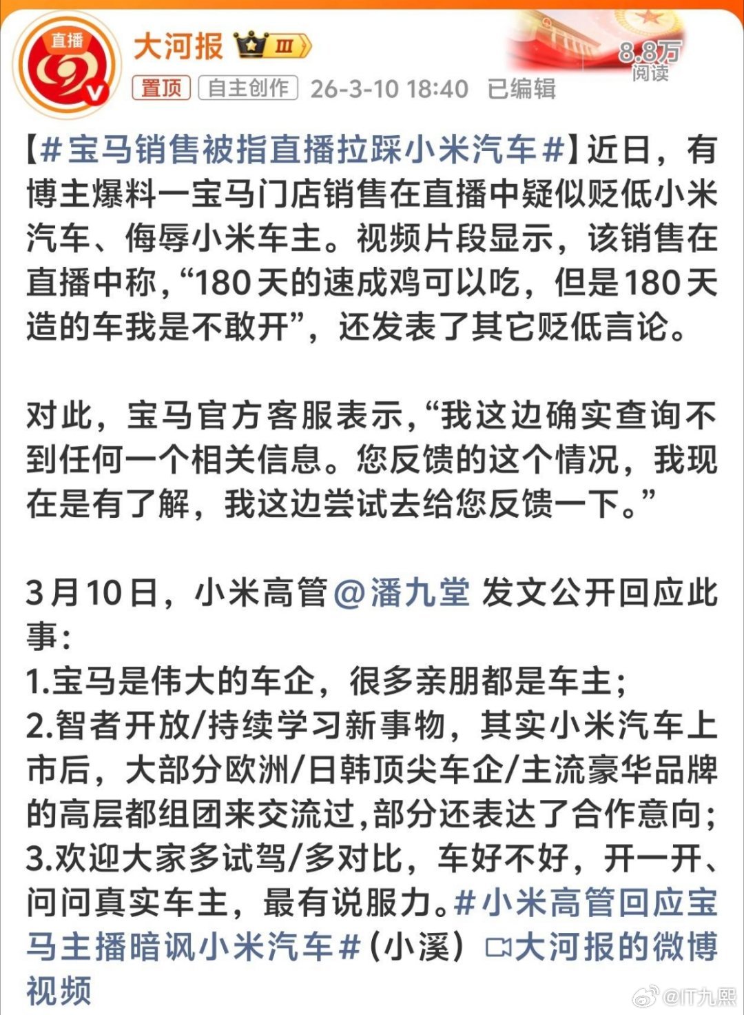 宝马主播嘲讽小米宝马4S店主播嘲讽小米汽车的言论发酵后,官方的处理方式堪称“教科书级别的冷处理”。
