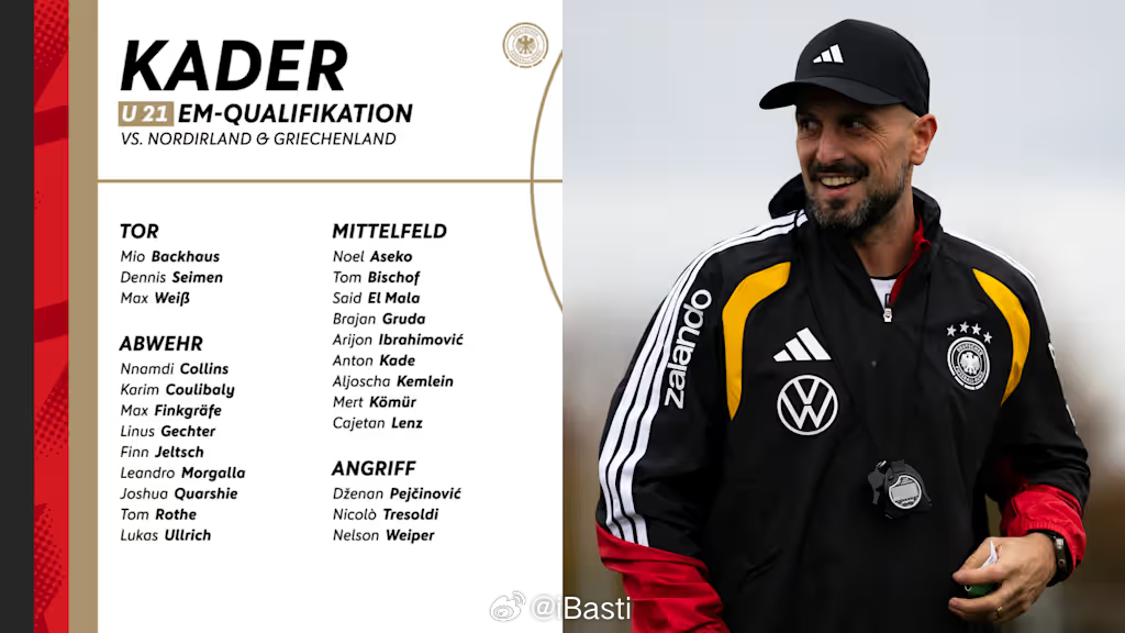 德国U21队新名单出炉,年仅18岁的云达不来梅左脚中卫卡里姆·库利巴利(图2)、19岁的波鸿中场卡耶坦·伦茨(图3)、即将满22周岁的莱比锡RB替补左后卫芬克格雷弗(图4)首次入选,没有入选国家队的赛义德·马拉当然榜上有名,但近期盛传会改投德国足协帐下的奥格斯堡中后卫诺阿凯·班克斯并没有入选,格鲁达和格希特回归,柏林联前锋安萨经与俱乐部协商后此次不入选。