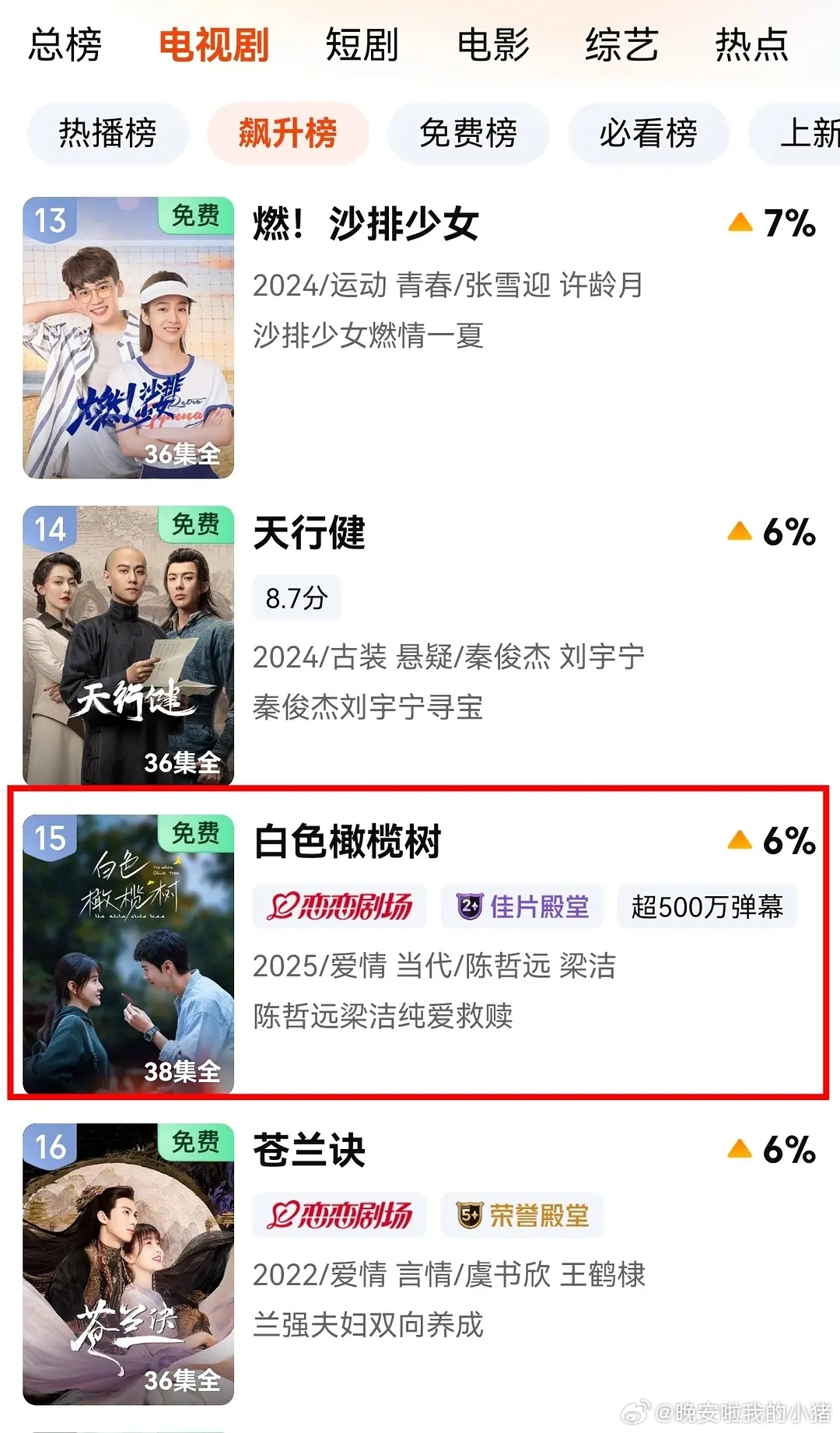 陈哲远一笑随歌飙升榜TOP3,白色橄榄树也好强啊都是25年的剧了
