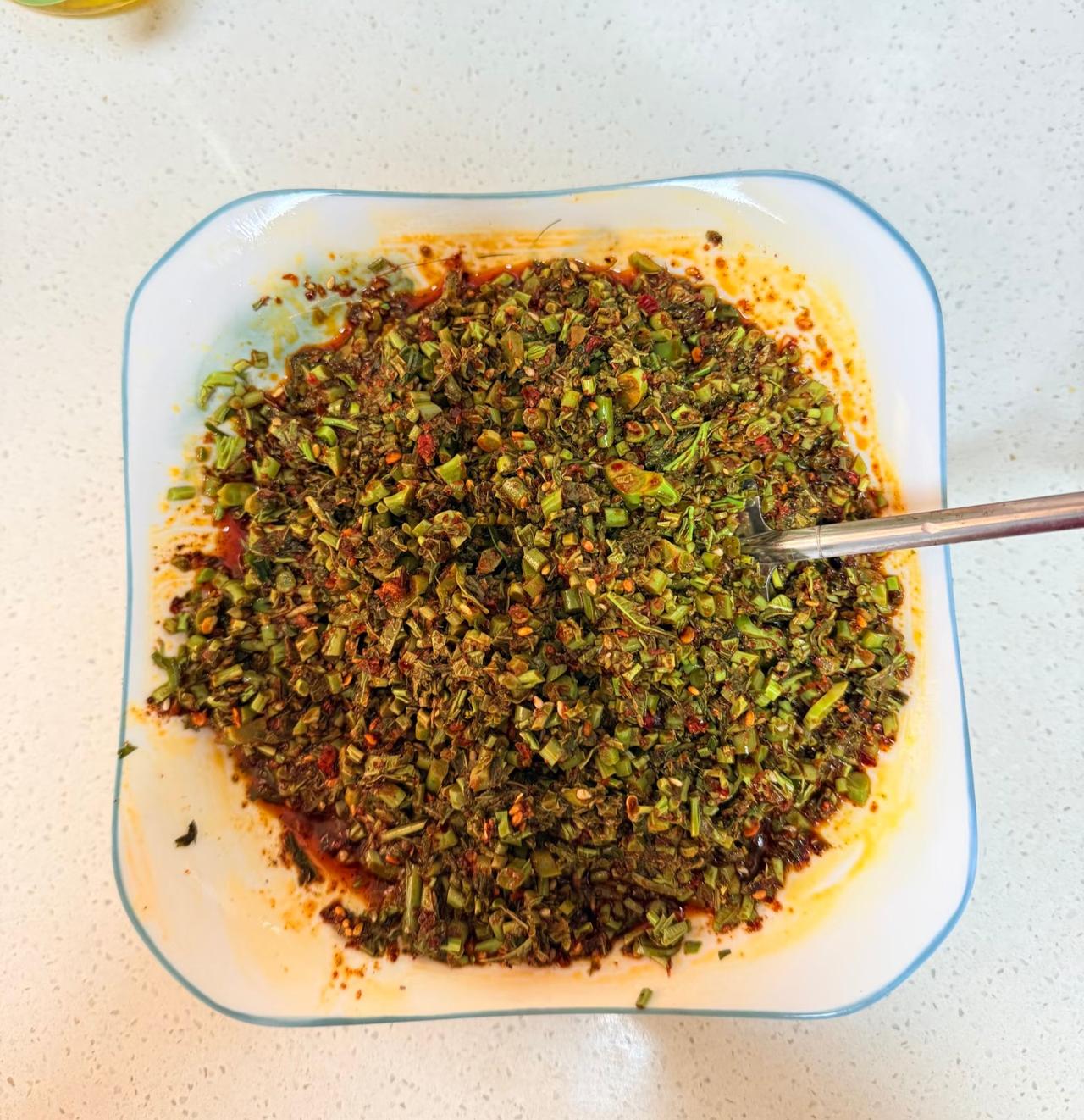 西北的朋友们, 看到这个你们馋了没? 我敢相信没有一个陕西娃, 能对这盘香椿辣子无动于衷。 小的时候最爱的美食 就是香椿辣子加馍 刚蒸出来的白面馍馍 从中间掰开 然后多放两勺香椿辣子酱 一口下去油香辣椒香 再裹着香椿的独特香味 别提有多美了 香椿 香椿酱 香椿芽辣子 蒜苗辣子夹馍 辣子美食 农家油辣子