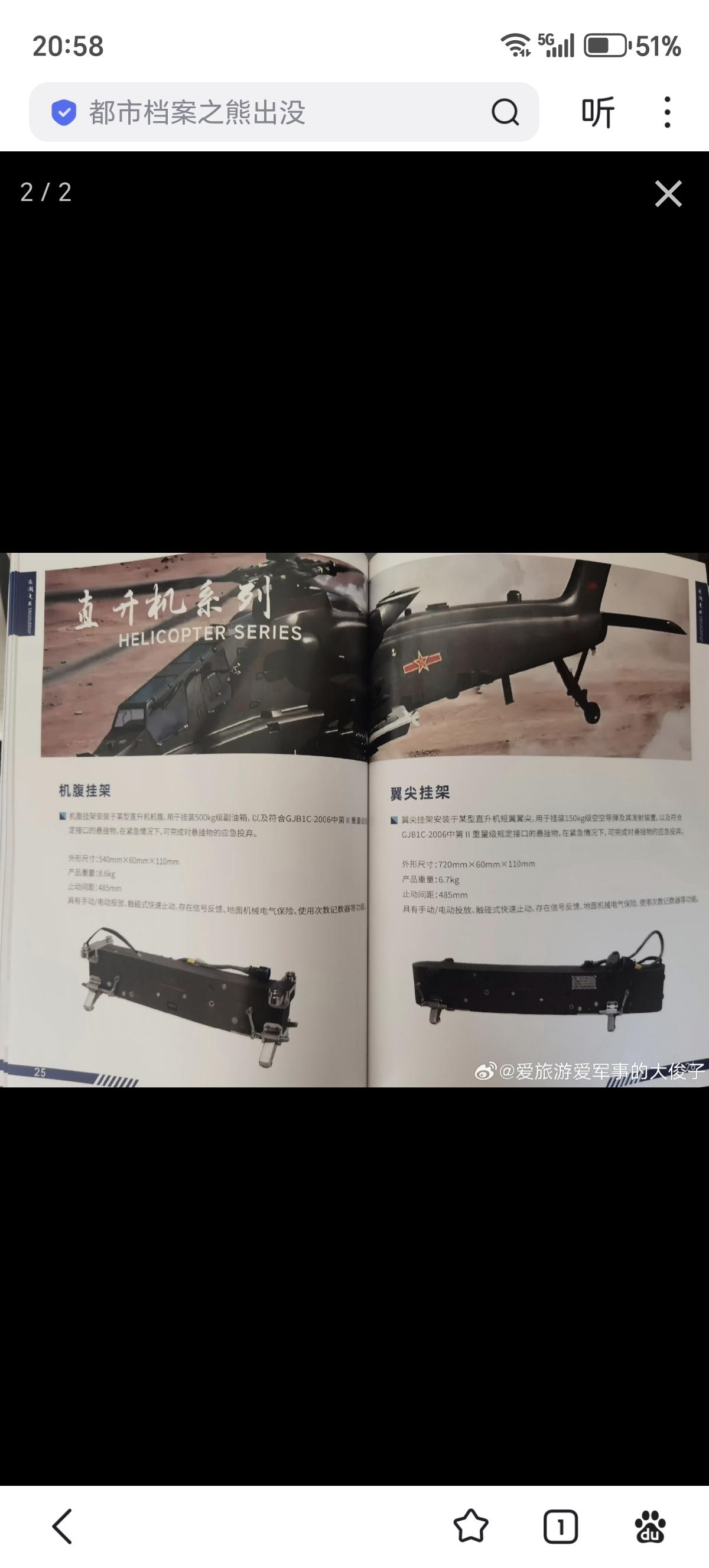Z-21的高清大图,携带2个500KG副油箱 注意机腹下的挂架是可抛弃的,紧急情况下可完成对挂载物的应急投弃。总共1吨副油箱可使Z-21的作战半径大幅增加,且不影响武器挂载 注意Z-21的翼尖挂架可挂载150kg级空空导弹或其他挂载,终于不是“巨大天燕90”了,而是新一代直升机/无人机用多用途弹