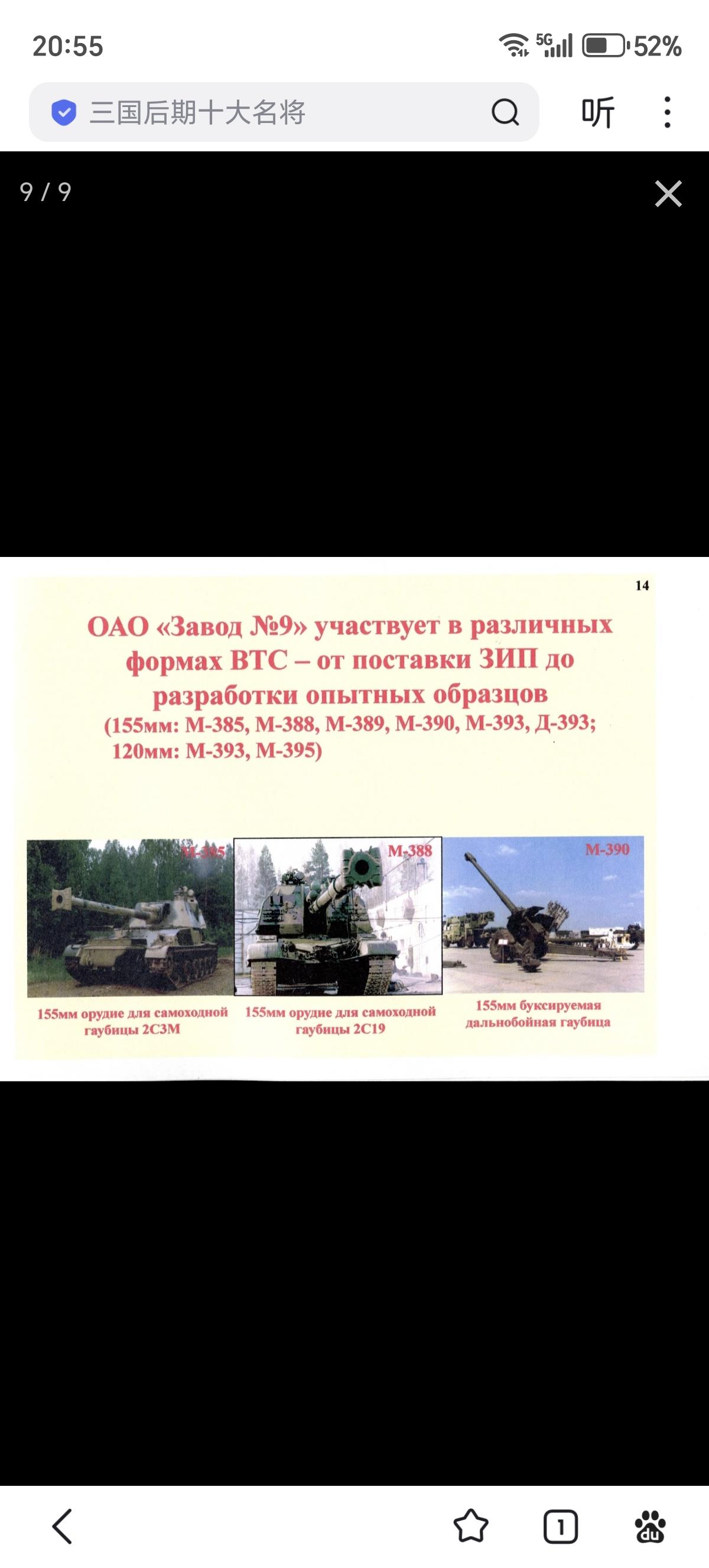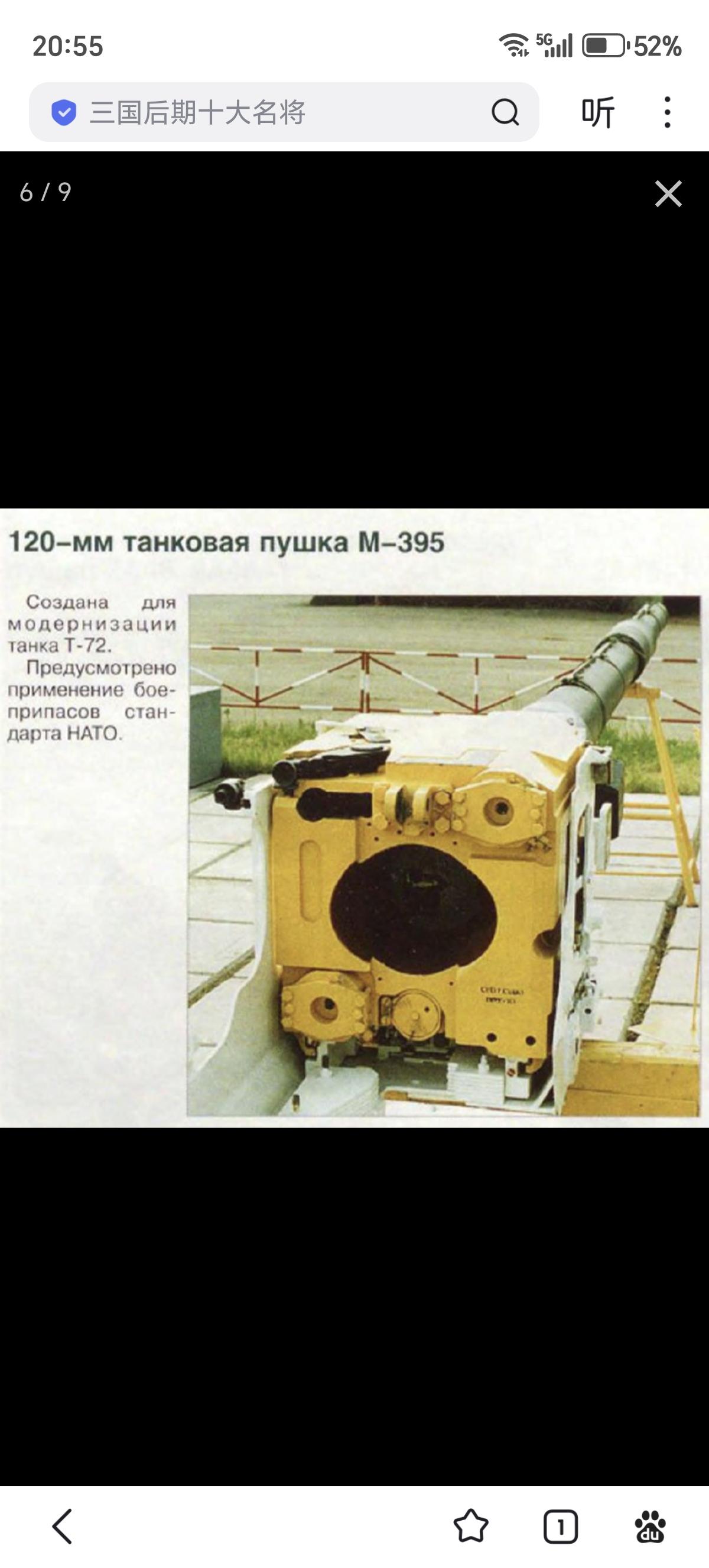 2006年底,位于俄罗斯叶卡捷琳堡的乌拉尔机车车辆厂旗下第9火炮兵工厂(Завод № 9)宣布完成研制并测试了两款新型120毫米口径滑膛炮,分别命名为M-393与M-395坦克炮。 M-393最早于2004年俄罗斯国际军备展览会(REA)上亮相,这是一门44倍径的120毫米滑膛炮,炮身管长5.3米,后坐行程达700毫米。该炮设计用于改装到T-62坦克上,T-62装备的是一门手动装填的2A20型115毫米滑膛炮。 M-393炮重2600公斤,配有隔热护套和火炮抽烟器,但没有配备炮口基准参照系统(MRS)。M-393设计安装在一个可360°水平旋转、俯仰角范围为-5°至+15°的炮塔上。据原厂宣传,M-393可兼容发射北约标准的120x570毫米整装弹,如德国莱茵金属公司生产的DM33、DM43 和DM53型尾翼稳定脱壳穿甲弹以及DM12型高多用途破甲弹。 第二种则是M-395,该炮在2006年俄罗斯国际军备展览会上公开,其炮管长度为50倍径(即6000 毫米),重2400公斤,最大后坐行程为310毫米。从外观看,M-395的炮尾与2A46M-1非常相似,后坐行程也相同。 M-395设计用于改装到T-72主战坦克上,其原先配备的125毫米2A46滑膛炮与弹盘自动装弹机搭配,第9火炮兵工厂也提供2A46M型进行改装。M-395的有效射程比M-393更远,但比豹2A6坦克上安装的莱茵金属120毫米L55火炮射程更短,炮口初速也更低。 M-393和M-395都是设计用于出口市场,一开始打算主要和乌克兰的KBM-2滑膛炮竞争,后者曾被设计安装于T-84-120、T-72-120、T-62-120等坦克作为升级包推销。