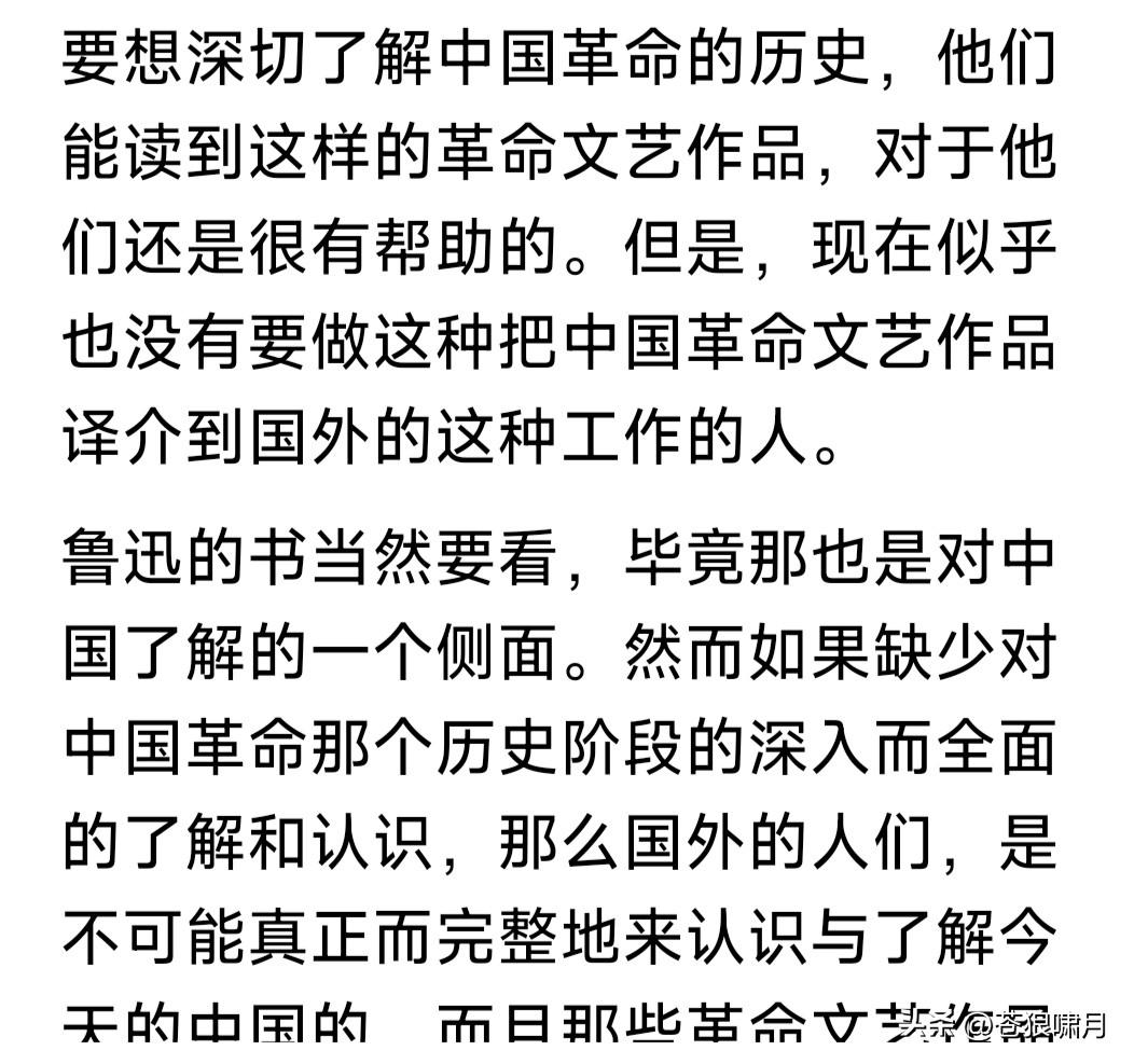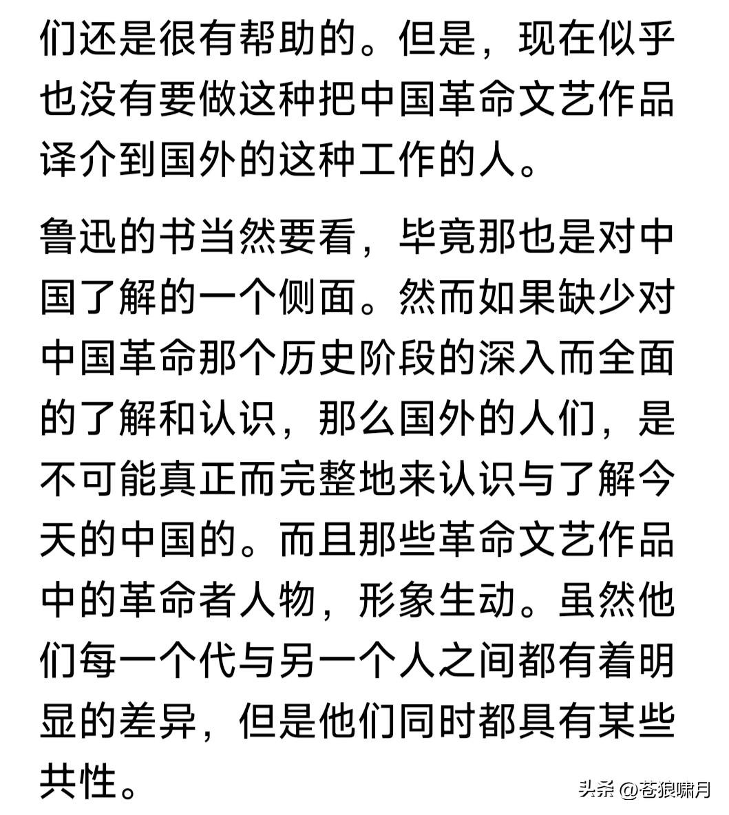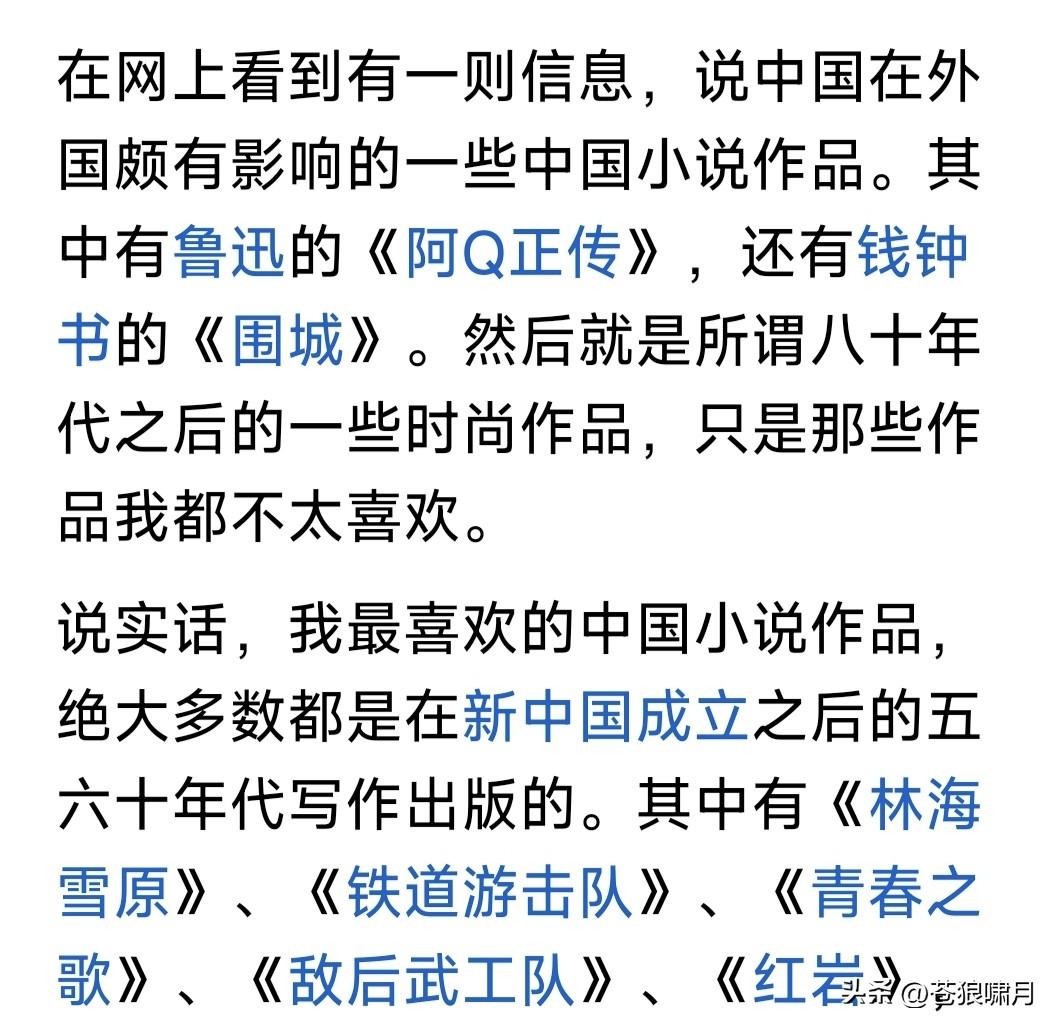 这个老胡的观点,苍狼不赞同。他说:向全世界推介中国的革命文艺作品,很有必要!虽然他的理由是,让外国人阅读这些作品,了解中国革命历史! 苍狼想说的是,有这个必要吗?“老胡”也感叹:现在似乎没有从事这方面工作的人!为什么没有?是国家不重视?非也!只说明这些作品不合时宜了! “老胡”为何会有这种想法?其实他的叙述里,已经给出了答案。他说他不喜欢鲁迅的“阿Q正传”,钱钟书的“围城”,以及80年代后涌现的作家作品! 他只喜欢“林海雪原”“铁道游击队”“青春之歌”“敌后武工队”“红岩”,后来的“创业史”“艳阳天”,还提到两部“斯大林文学奖”作品:“太阳照在桑干河上”和“暴风骤雨”。他看过后者,印象深刻。 苍狼根据“老胡”自介,有以下感想: 1.他的头脑里还是“斗争”思维,殊不知现在是法治社会,有问题靠法治解决,而不是靠“斗争”!“斗争”只会导致社会群体对立,阻挠国家持续发展! 2.他喜欢的那些作品,是“斗争”年代产物。当时具有合理性,作家也有才华,作品也很生动,但缺乏思想性。改革开放后退出历史舞台是时代取舍。新一代作家作品脱颖而出是顺应潮流! 3.他建议把“革命文艺向世界推介”,是一厢情愿,也是思想落伍的表现。当今世界各国,有几个还在搞“阶级斗争”?除了非洲南美中东某些贫穷国家,还有谁呢?他们会阅读这些作品吗? 4.苍狼不知这位“老胡”,过去做什么工作?现在应该是退休人员?闲来无事,网络发表一些观点无可非议,但拿这些过时观点说事,觉得好意思吗? …………