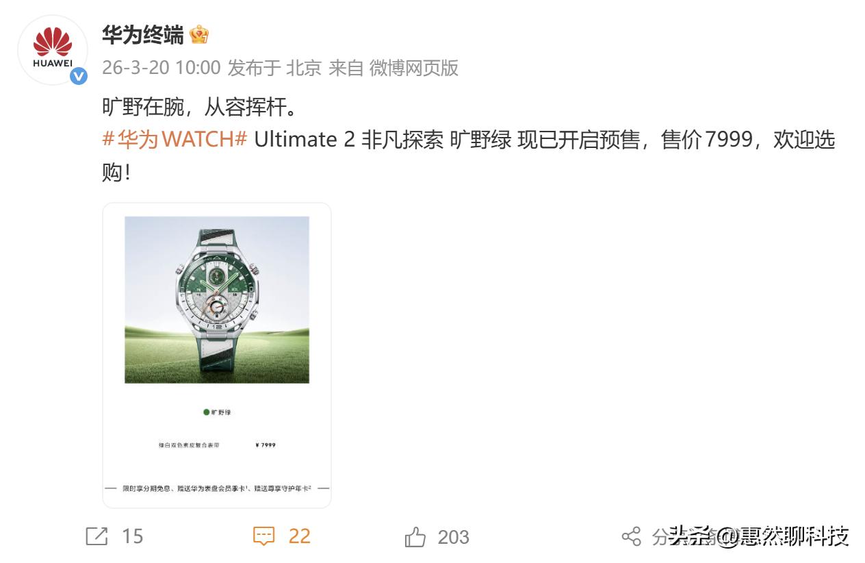 7999元,华为定义高端智能腕表新标杆!华为WATCH Ultimate 2非凡探索 旷野绿正式开启预售,这款被称作新一代 “全能表王” 的新品,凭借极致的工艺、高端的设计、硬核的科技,成为高端用户腕间体验的全新选择!华为向来深谙高端用户的核心需求,既追求传统高端腕表的审美质感与格调彰显,又需要智能设备的科技实力与功能适配,而华为WATCH Ultimate 2非凡探索 旷野绿,正是为满足这一需求而生。 在工艺上,它延续了Ultimate系列的极致追求,非晶锆合金表体、蓝宝石表镜、双色纳米微晶陶瓷表圈,每一处细节都尽显匠心;在设计上,融合自然原野灵感与高端制表艺术,旷野绿的主色调搭配山峰状纹路,让腕表兼具自然美感与探索气质,佩戴在腕间,轻松成为穿搭亮点,彰显智慧非凡的个人格调;在功能上,它更是做到了全能,不仅延续了系列经典的北斗卫星通信、百米潜水级防水等户外硬核科技,还在高尔夫专业功能上持续进阶。此次新品就在AWE 2026展会直播、深圳高尔夫展上展陈上受到了专业圈层的认可。 从IDC数据来看,华为早已稳坐中国腕戴设备市场第一的位置,而这款新品的推出,更是华为在高端智能腕表赛道的又一次发力,它不仅是一款智能腕表,更是高端用户探索生活、彰显格调的伙伴,7999元的定价,匹配的是极致的工艺、科技与体验,新一代全能表王,值得每一位追求高品质生活的探索者入手!