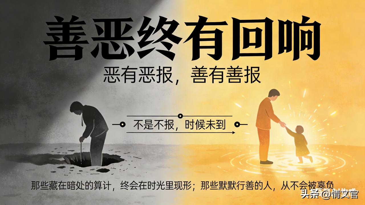 善恶终有回响 你信吗?恶有恶报,善有善报。 不是不报,时候未到。 那些藏在暗处的算计,终会在时光里现形。 那些踩过的坑、骗过的人,早晚会以另一种方式反噬。 而那些默默行善的人,从不会被辜负。 一句善意的提醒,一次伸手的相助, 都会变成照亮前路的光,悄悄回馈。 做人留一线,日后好相见。 心怀善念,行稳致远, 这世间的公平,从来都不会迟到。 善恶有报 人生感悟