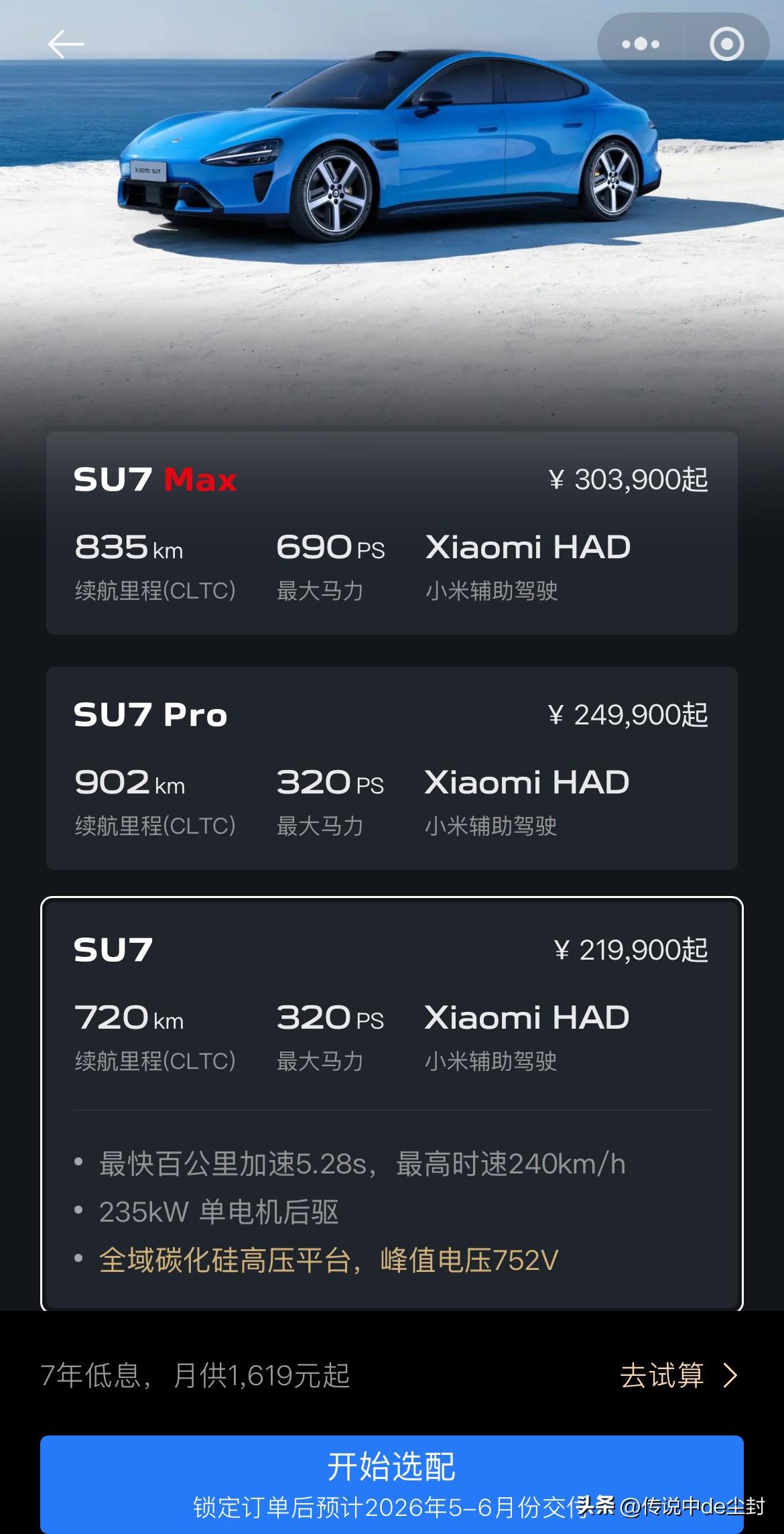 “新一代SU7,从开售到现在,“锁单”进展一直比第一代更好” 这句话很关键啊…… 第一代SU7有多么成功,已经是众所周知的事实了,新一代SU7开售后,锁单进展比第一代还要好,“锁单”可是不可退的,不像“大定”还有犹豫期,锁单更能反应未来真实销量。 看了下小米官方,现在订购新一代SU7的标准版和Pro版,预计都要5-6月份交付了,Max版甚至要到5-7月份交付(图三)。 不过,各版本的准现车还是有的挑选(图二),准现车的话是预计1-6周交付。 感觉好像大家还是更喜欢定制一些……