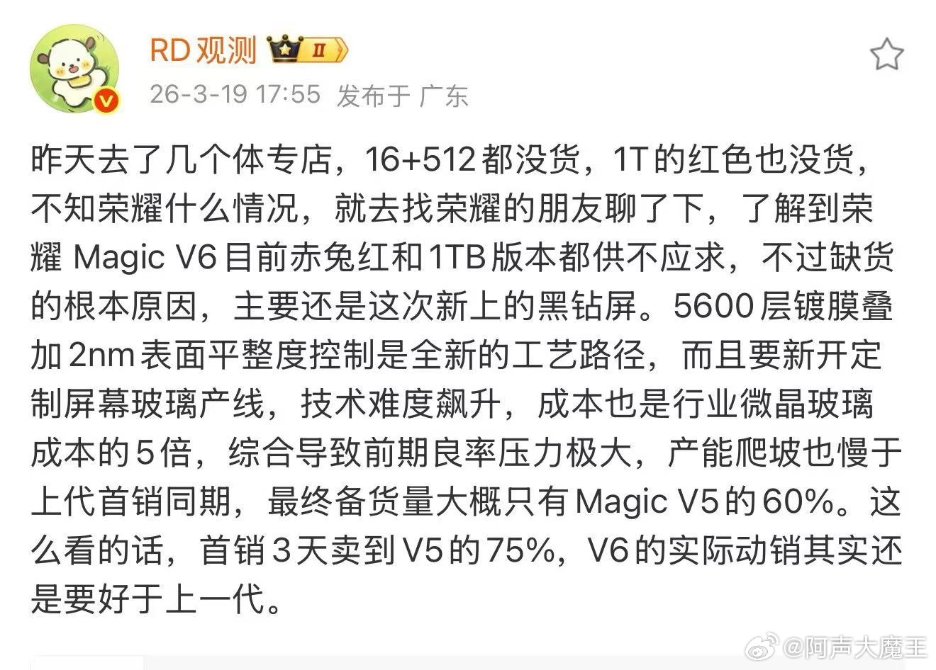 荣耀Magic V6 首销卖爆了,而且是大储存版本售罄~以我上手体验来看,它值得。尤其黑钻屏的手感是真好,不贴膜也耐磨耐刮,强光下也清清楚楚。不过正因为屏幕工艺复杂、成本高,良率和产能都在爬坡,导致产能供不上需求。