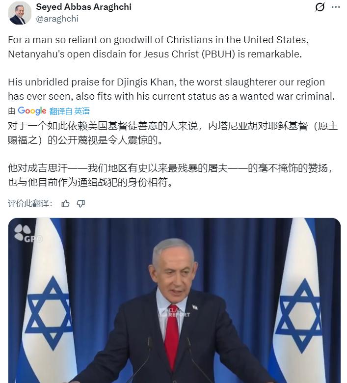伊朗外长阿拉格奇:“对于一个如此依赖美国基督徒善意的人来说,内塔尼亚胡对耶稣基督的公开蔑视是令人震惊的。他对成吉思汗——我们地区有史以来最残暴的屠夫——的毫不掩饰的赞扬,也与他目前作为通缉战犯的身份相符。” 此前,内塔尼亚胡叫唤:“仅仅具备道德是不够的,仅仅有正义也是不够的。耶稣基督并不比成吉思汗更有优势。如果你足够强大、足够残忍、足够有力,邪恶终将战胜善良。” 其后以色列总理办公室刚刚紧急发帖:“内塔尼亚胡今晚在新闻发布会上并没有诋毁耶稣基督。即使是道德高尚的文明,如果缺乏自卫能力,也可能败给残暴的敌人。并无冒犯之意。”