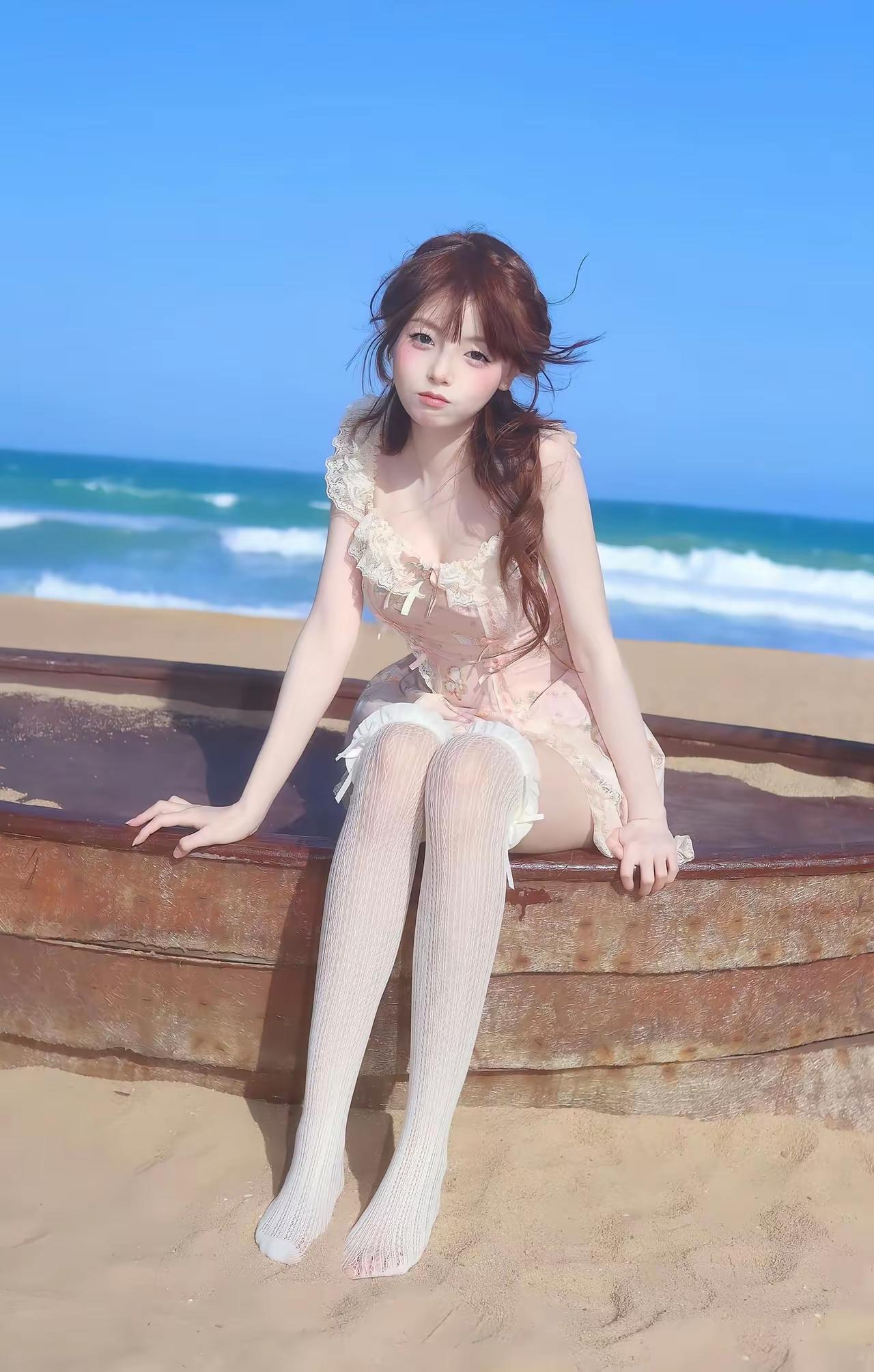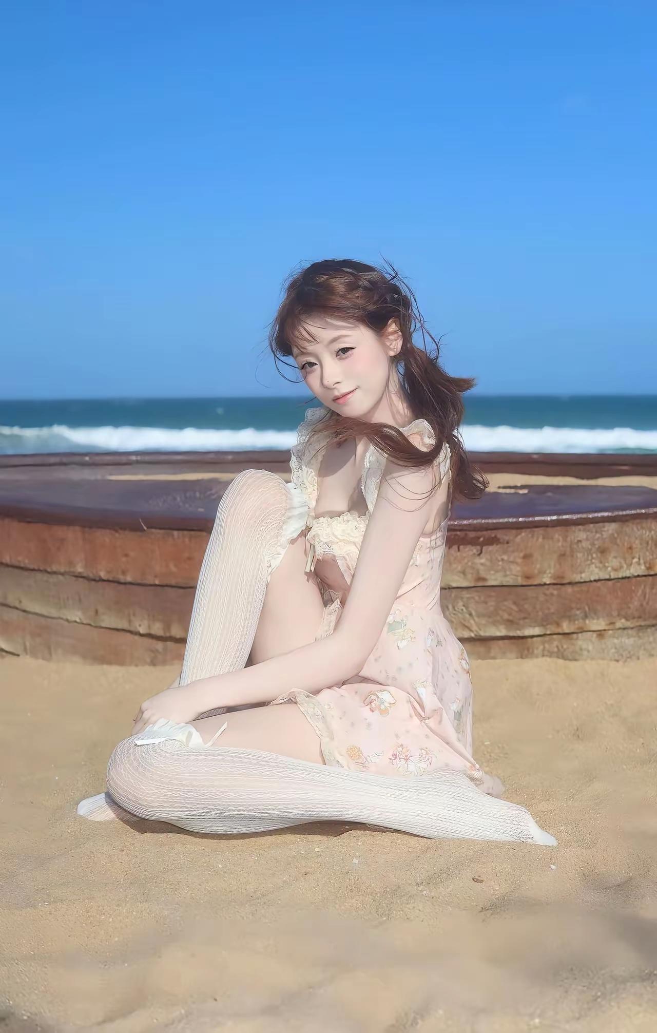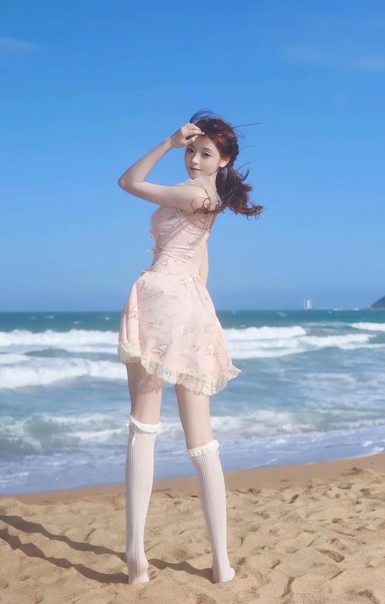 温柔粉毛衣搭配白色裙摆,手机自拍时刻📸