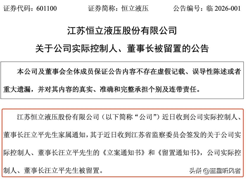 惊爆!1300亿上市公司董事长被留置,下周股价要“变天”? 家人们,今天A股市场又炸出个大消息!液压龙头恒立液压的董事长汪立平被留置了,这消息一出来,估计不少股民的心都跟着揪起来了。 恒立液压那可是A股有名的大牛股啊。今年年初的时候,它股价一路狂飙,直接冲到了125.98元/股,和2024年7月的低点比起来,累计涨幅高达207%,最新总市值也有1336.4亿元呢,这成绩相当亮眼。可谁能想到,突然就出了这么个事儿。 不过,恒立液压在公告里也说了,公司已经对相关工作做了妥善安排。日常经营管理有高管团队负责,其他董事和高级管理人员也都正常履职,生产经营情况一切正常,还说这事儿不会对公司生产经营产生重大影响。可即便如此,这董事长被留置这么大的事儿,对股价的影响肯定还是有的。 咱再来说说恒立液压为啥能成为大牛股。一方面,它作为液压件龙头企业,核心产品受益于下游挖掘机行业需求回暖。2025年1—9月挖掘机销量达17.40万台,同比增长18.1%,国内和出口销量都涨了,这直接带动了恒立液压的销量和盈利能力提升。另一方面,它在机器人丝杠领域的布局也是市场炒作的焦点。丝杠可是人形机器人线性关节的核心零部件,特斯拉Optimus好多关节都用到了丝杠。恒立液压早在2021年就投资15亿元建设线性驱动器项目,技术储备和产能布局都挺领先。华西证券和浙商证券的研报也都看好它新业务的发展,觉得它有望再造一个恒立,构建新成长极。 可现在董事长被留置了,这就像一颗“定时炸弹”,让下周的股价充满了不确定性。从短期来看,市场情绪肯定会受到冲击,很多投资者可能会因为恐慌而选择抛售股票,导致股价下跌。毕竟董事长是公司的核心人物,他的变动很容易引发市场对公司未来发展的担忧。 不过,从长期来看,还得看公司的基本面和业务发展情况。如果恒立液压能像公告里说的那样,生产经营不受影响,新业务也能按计划推进,那等市场情绪稳定下来,股价还是有回升的可能。而且,它在液压件和机器人丝杠领域的优势还是很明显的,要是能抓住行业发展的机遇,未来的业绩说不定还能继续增长。 家人们,对于恒立液压下周的股价走势,你们怎么看呢?是觉得会大跌,还是能稳住甚至反弹?欢迎在评论区留言讨论,咱们一起交流交流。投资有风险,入市需谨慎,咱们还是要理性看待股价的波动,做好风险控制。 A股市场