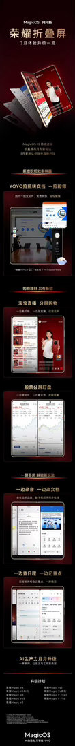 说白了,它让折叠屏的“大屏”不再只是看视频爽,而是真的帮你同时干好几件事,省时又顺手。这才是大家当初买折叠屏真正想要的——一屏搞定所有,效率翻倍。MagicOS月月新MagicOS10