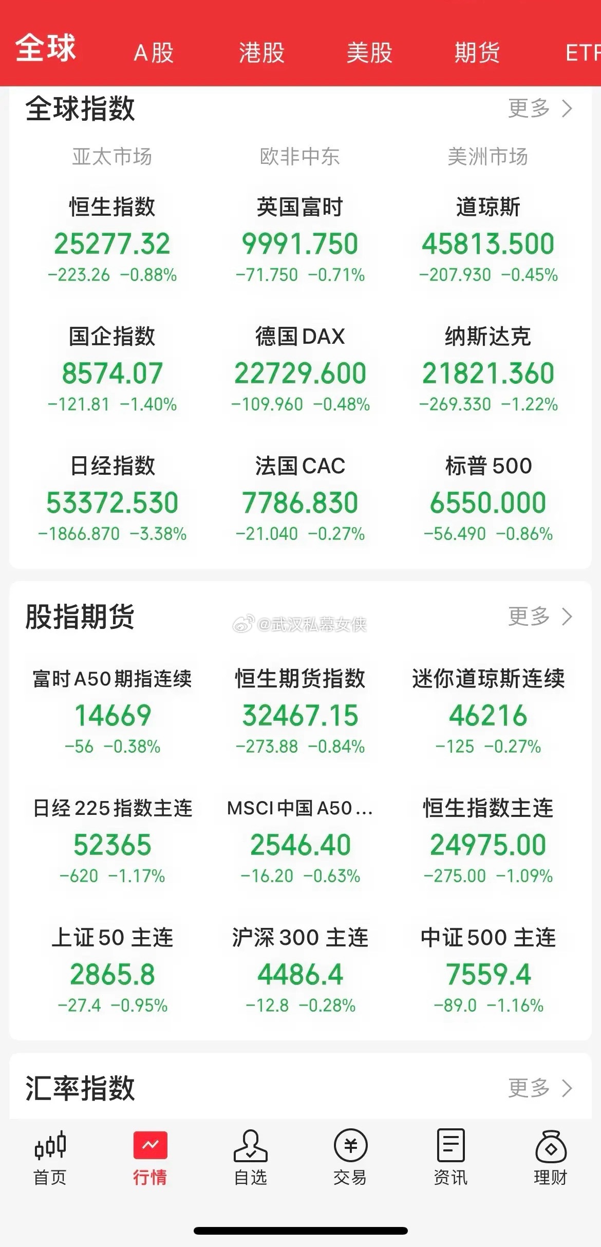 纳斯达克跌1.38%,道琼斯跌0.68%,富时a50跌0.46%,恒生期货指数跌1.22%,中概股跌2.06%,日经1.36%。这次不仅仅是A股跌,全球跟跌。放宽心态。